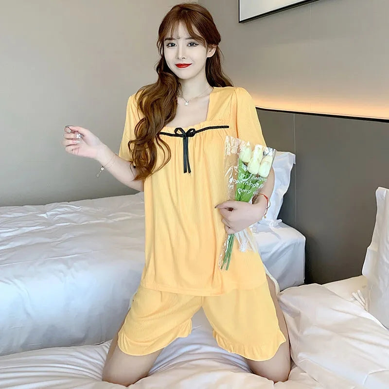 Summer Short Sleeve Shorts Pajamas Women 2 Piece Set Thin Loose Kawaii Princess Style New Square Neck Women Home Wear Pantsuits