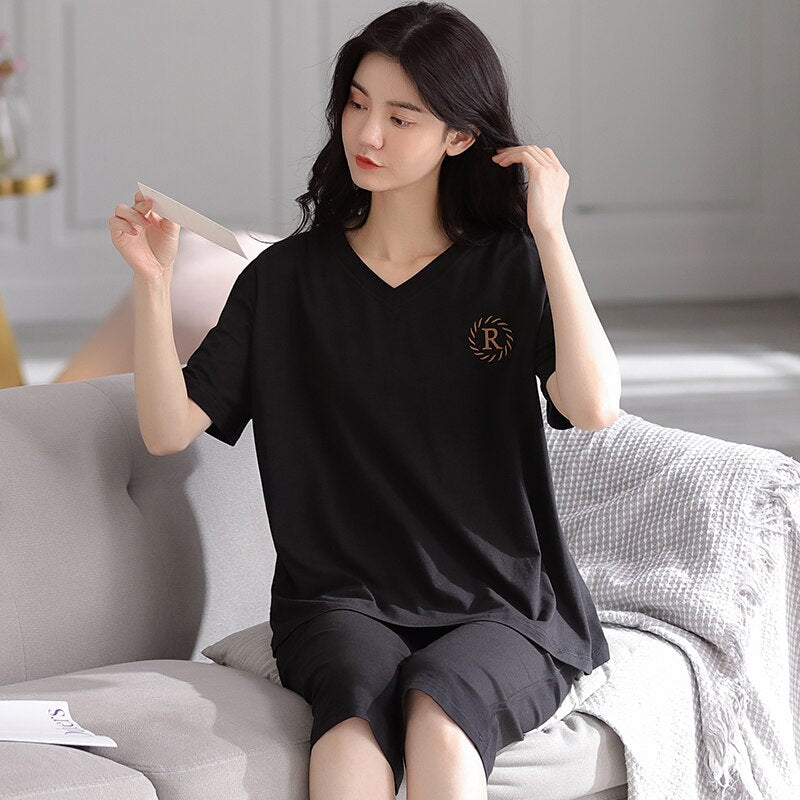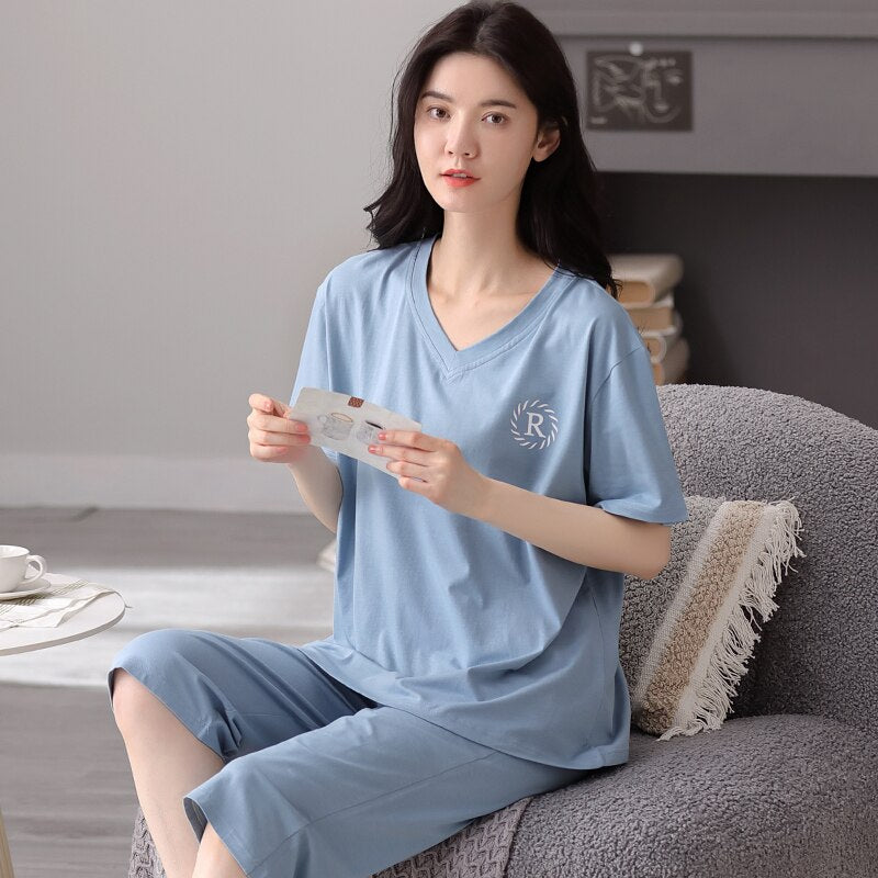 Summer Women Pajamas Set Soild Modal Cotton Nightwear Short Sleeve + Calf-Length Pants Sleepwear Girls Fashion XXL Homewear