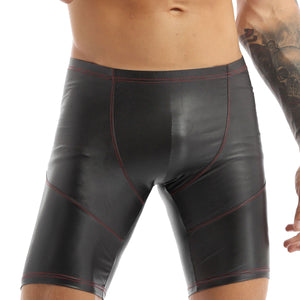 Mens Hot Faux Leather Boxer Shorts Sports Swimming Trunks Swimwear Bulge Pouch Low Waist Elastic Waistband Underpants Underwear