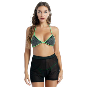 Womens Lace-up Bathing Suit Halter Neck Unlined Bra G-string Underpants With Transparent Mesh Shorts Shiny Rhinestone Beachwear