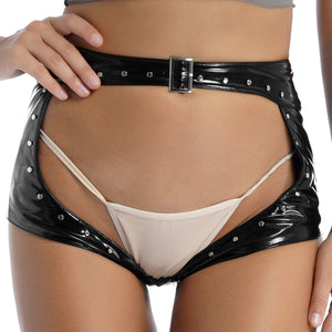 Womens Pole Dance Costumes Cutout Front Patent Leather Boxer Brief Boyshorts Rivet Wet Look Boxers Shorts Hollow Out Hot Pants