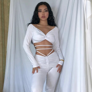 Off the Shoulder V Neck Black White Two Piece Set Women Sexy Long Sleeve Bandage Crop Top + Pants Slim Sporty Tracksuit Women