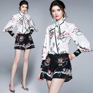 Autumn Lantern Long Sleeve Floral Print Gothic Two Piece Pants Suits Women's Tops And Shorts White Shirt + Wide Leg Shorts Sets