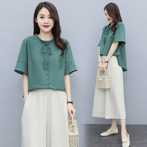High Quality Cotton Linen Pant Sets Women Tracksuit Button Shirt High Waist Knee-length Pants Two Piece Suit Casual Streetwear