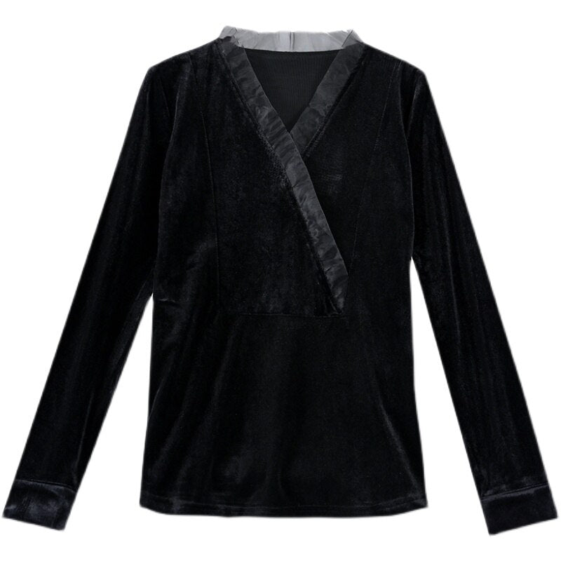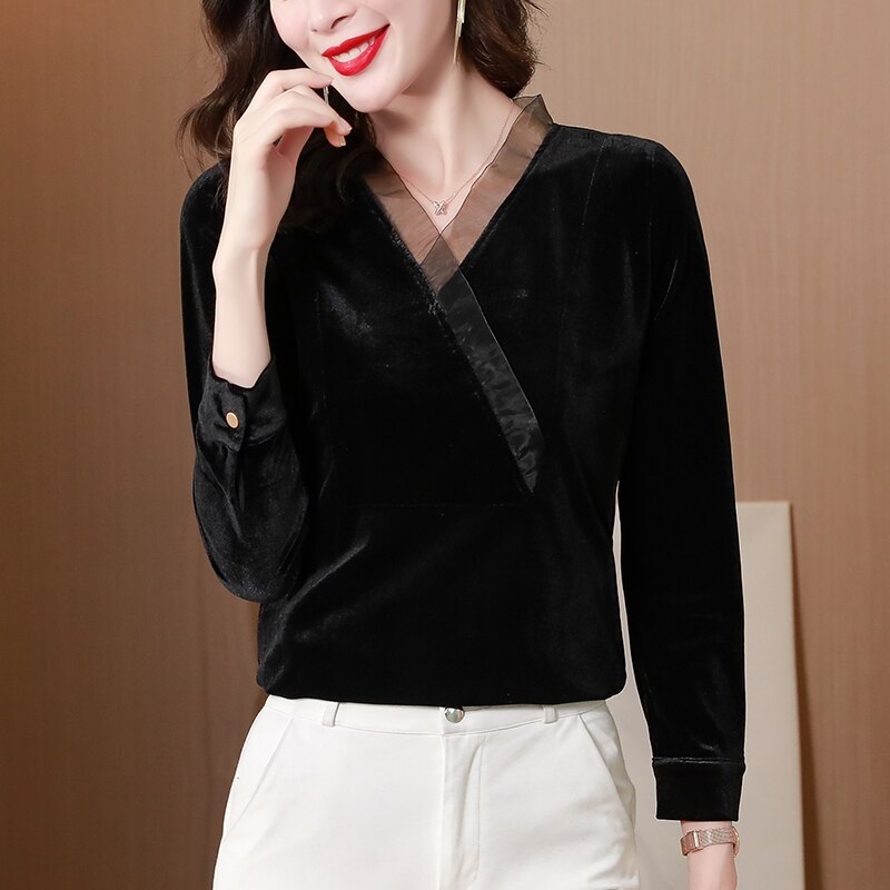 2021 Autumn Winter Gold Velvet Women's T-Shirt Fashion Casual Stitching Organza Bottoming Shirt M-4XL Plus Size Tops