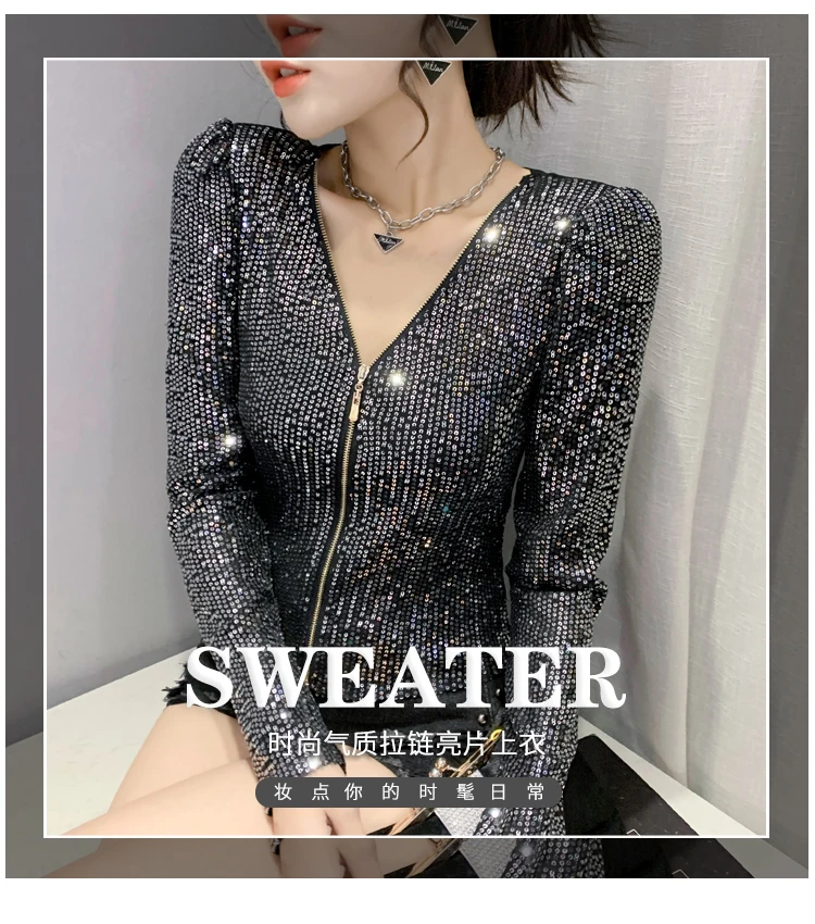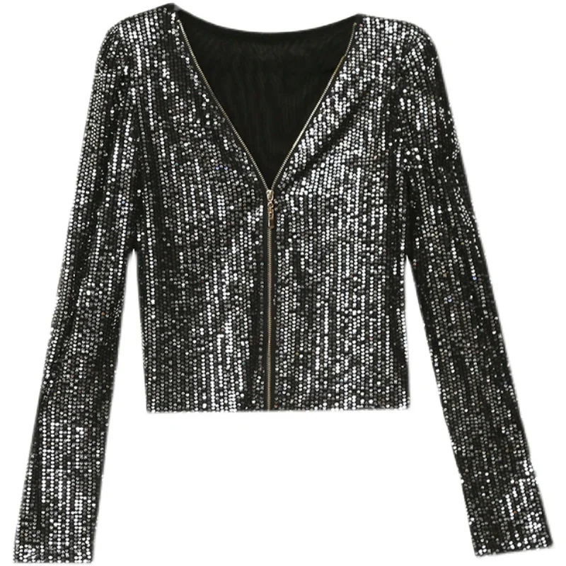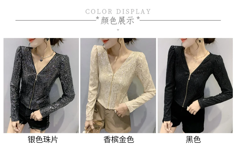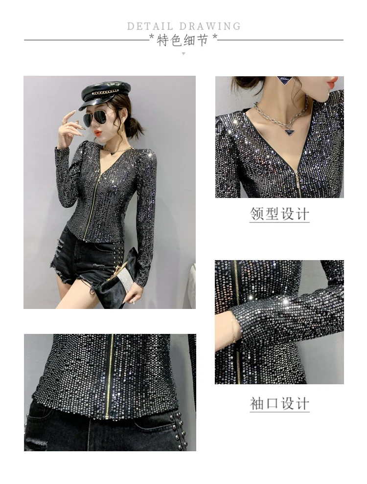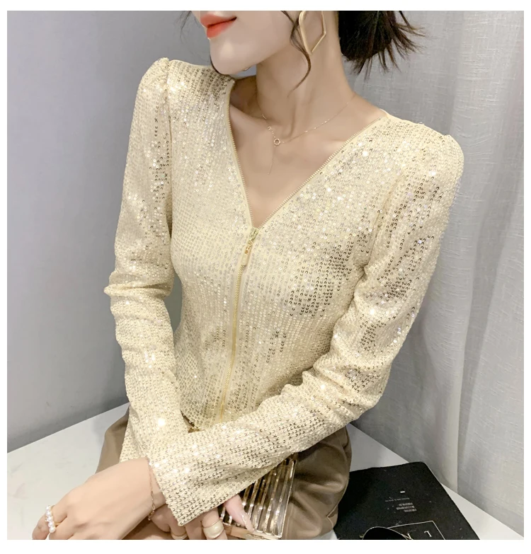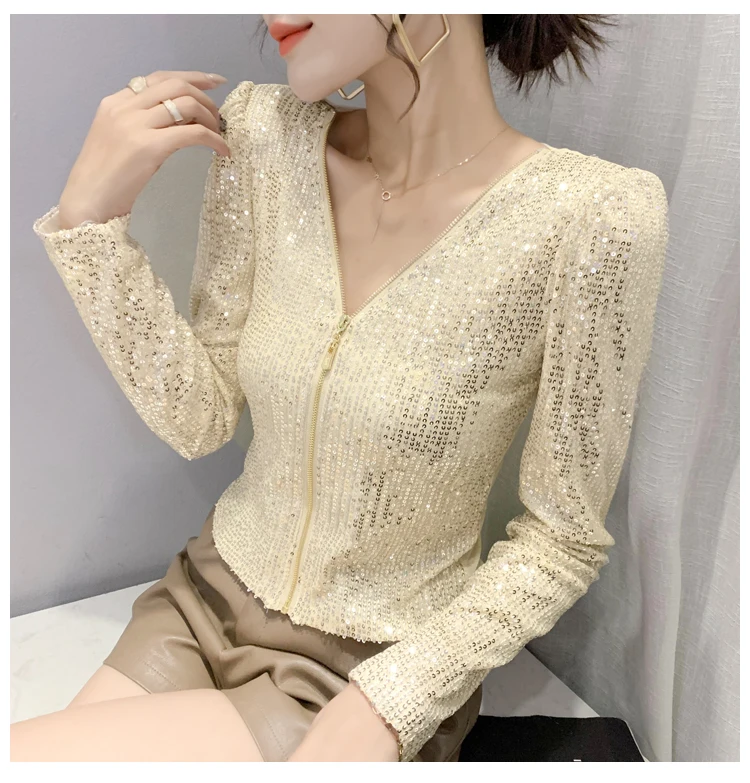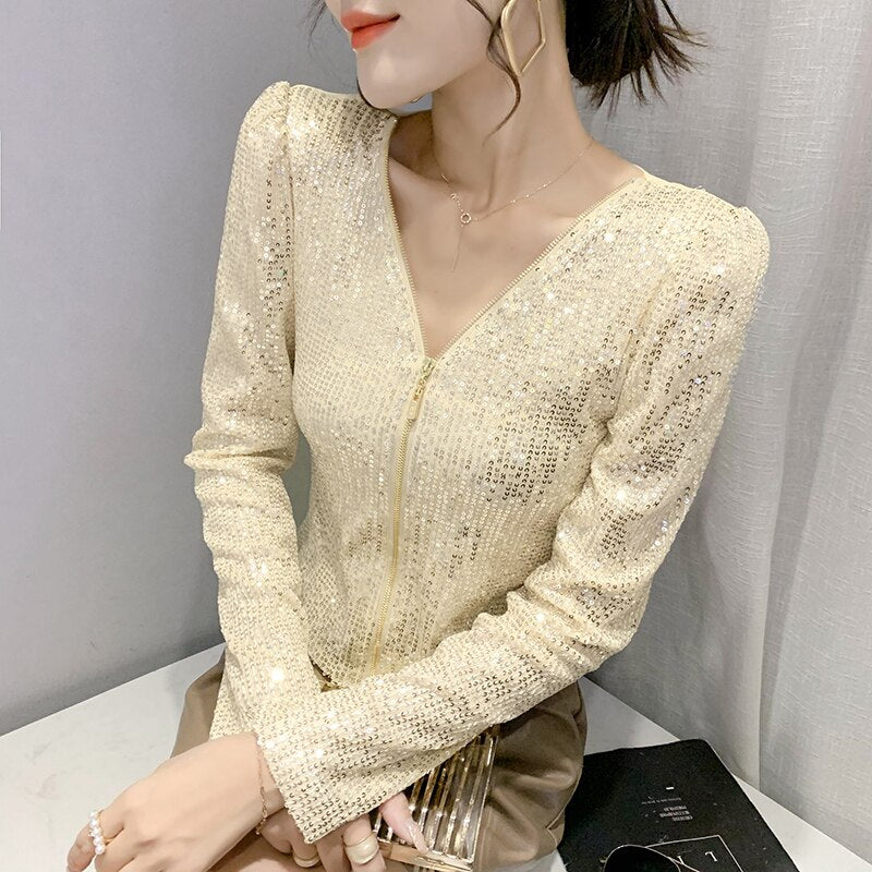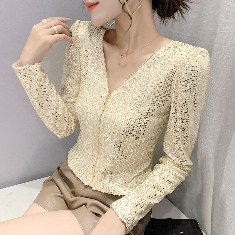 2022 New Spring Women's T-Shirt Fashion Casual Sequined V-neck Long-Sleeved Mesh Tops Elegant Slim Plus Size Women Clothing