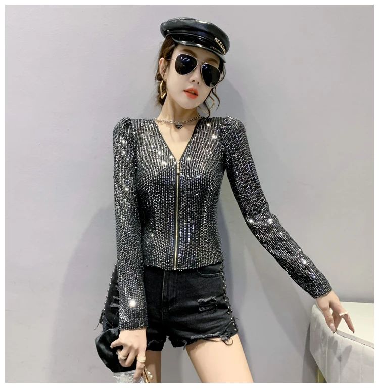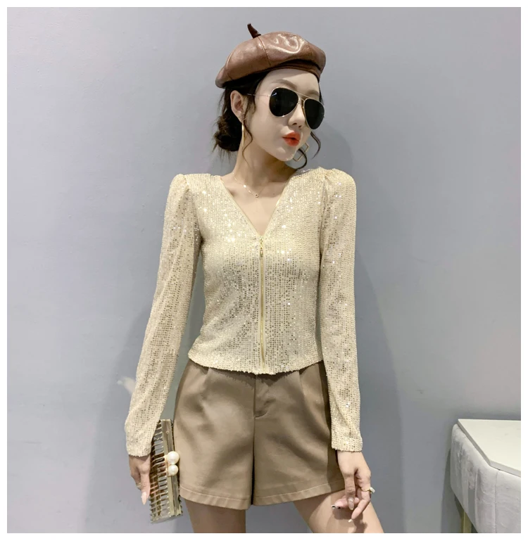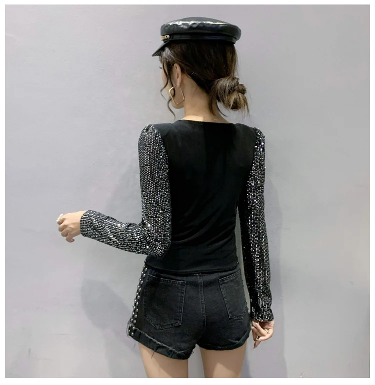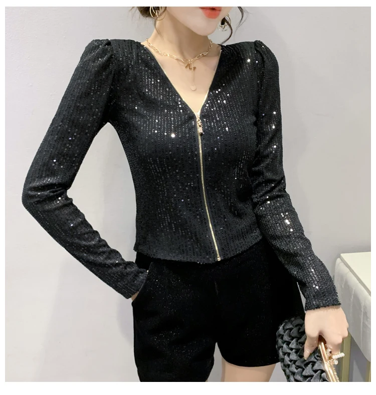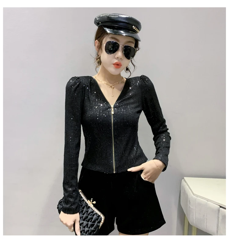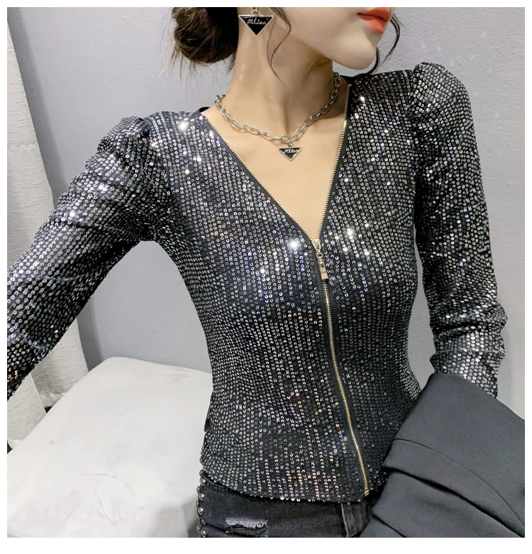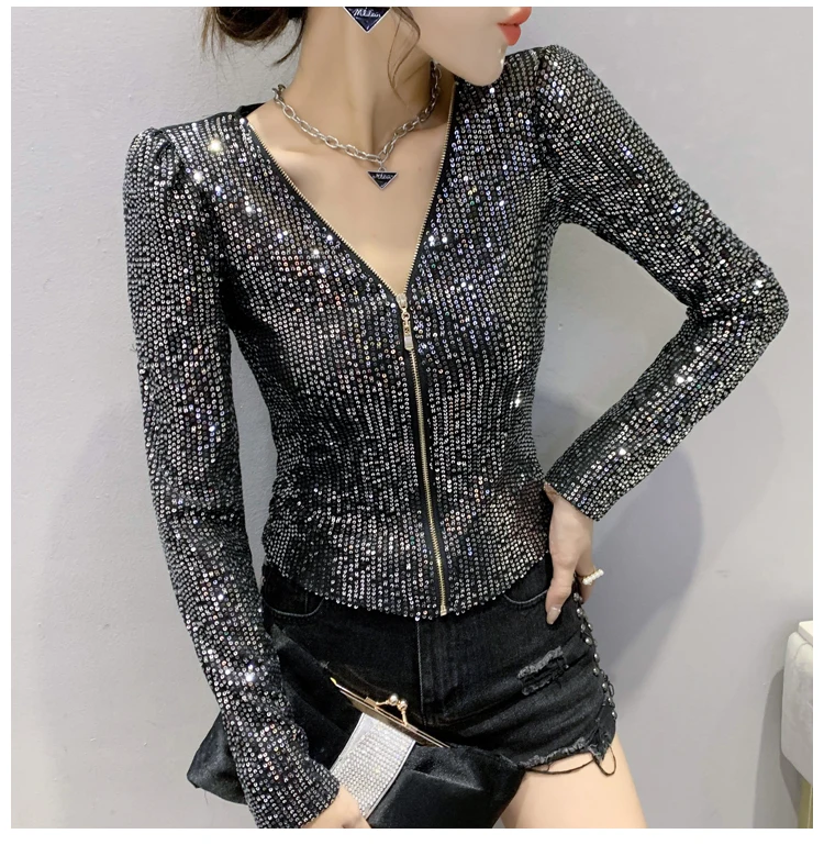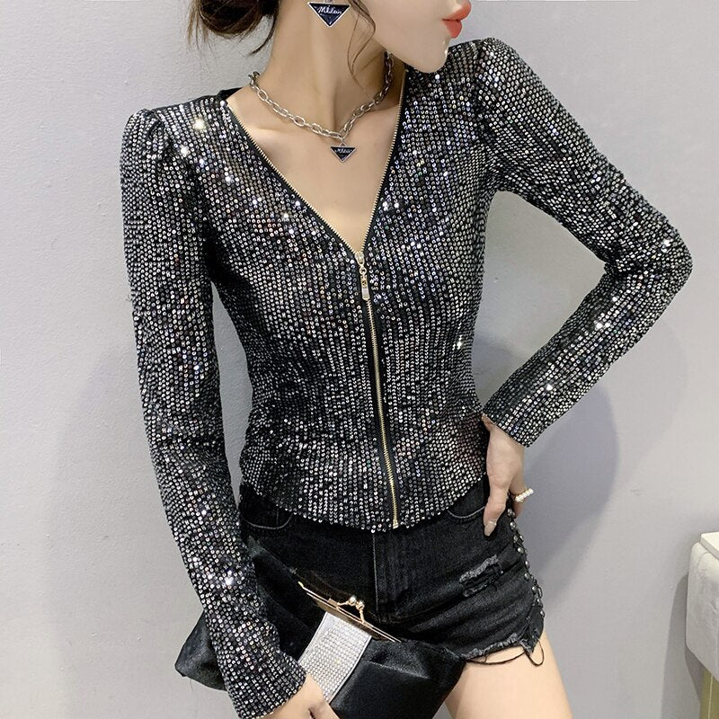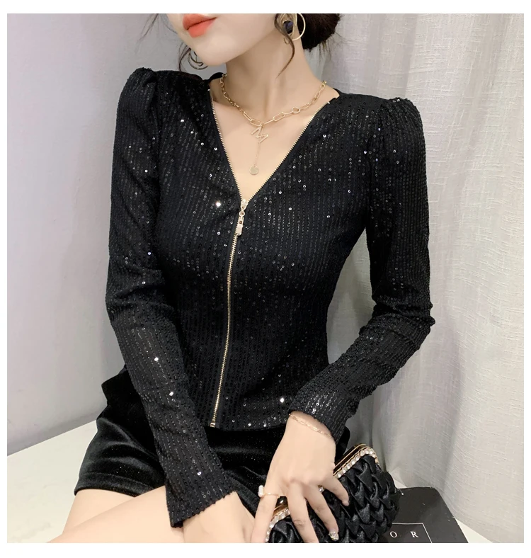 2022 New Spring Women's T-Shirt Fashion Casual Sequined V-neck Long-Sleeved Mesh Tops Elegant Slim Plus Size Women Clothing