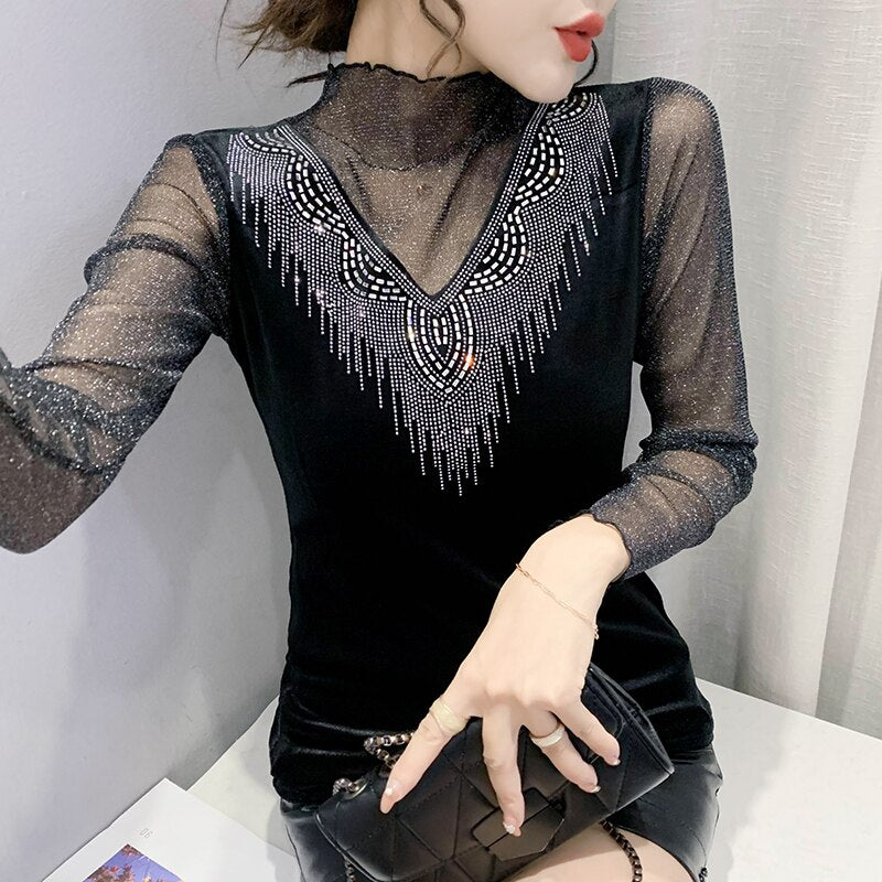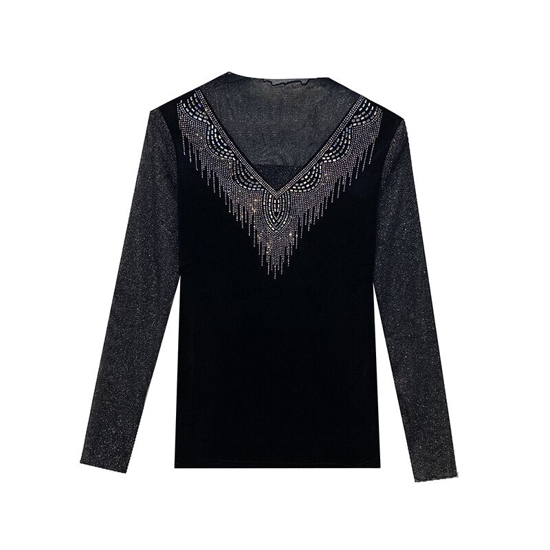 Autumn Winter Long Sleeved Mesh Tops Shirt Fashion Casual Diamonds Patchwork Women's T-Shirt Plus Size Female Clothing