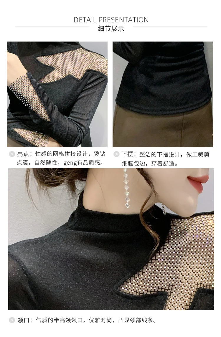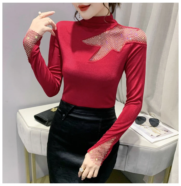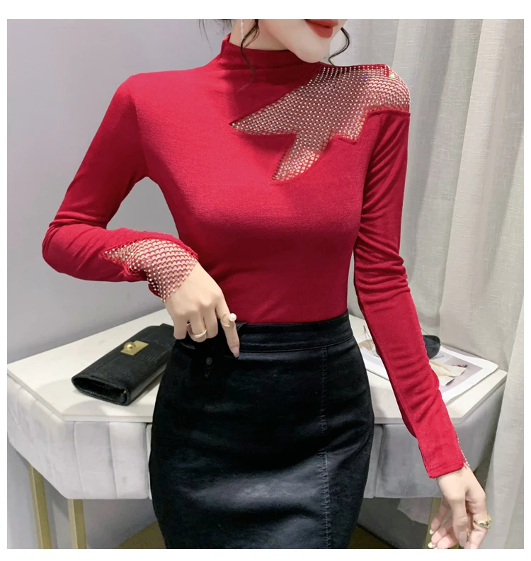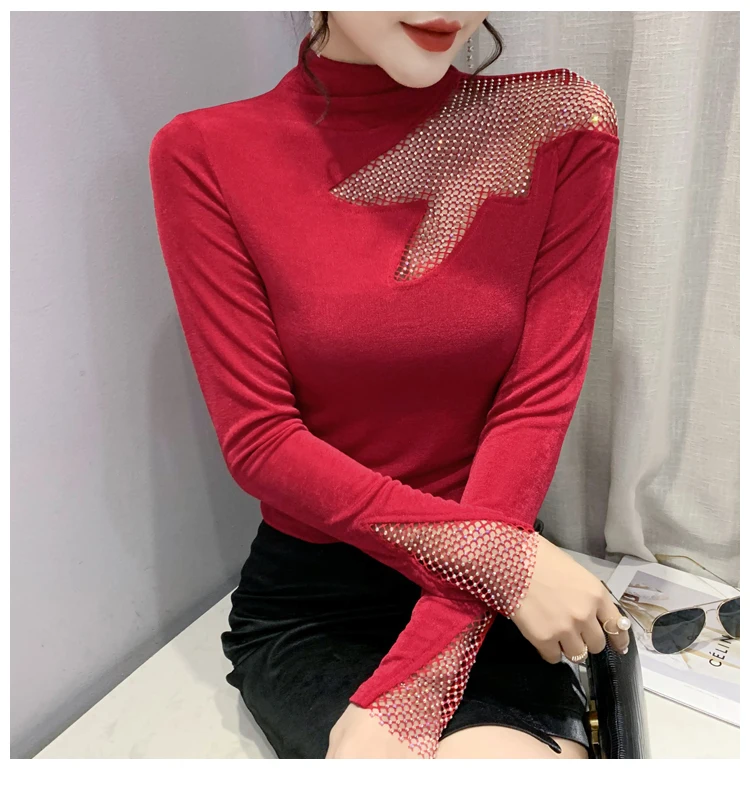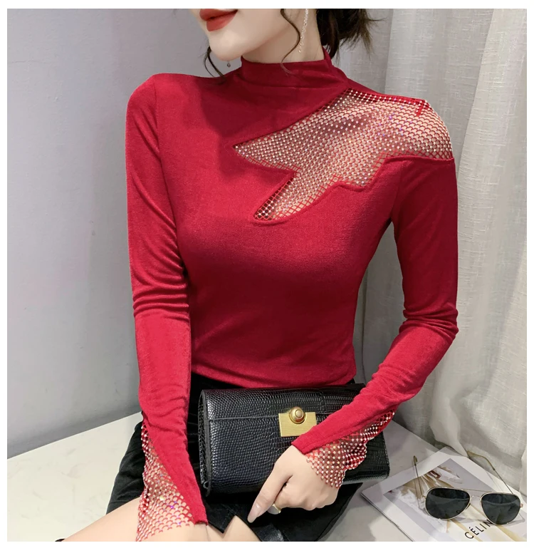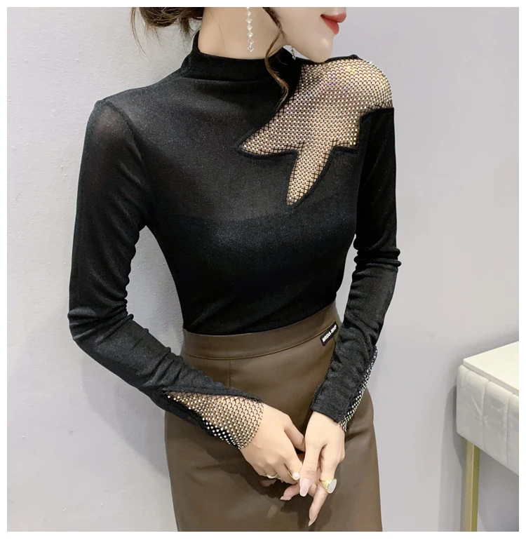 Autumn Winter New 2021 Women's Tops Shirt Fashion Sexy Hollow Out Diamonds Long Sleeve Mesh T-Shirt Plus Size Female Clothing