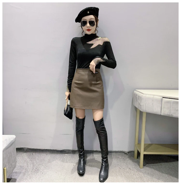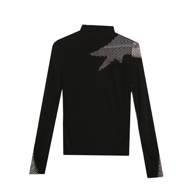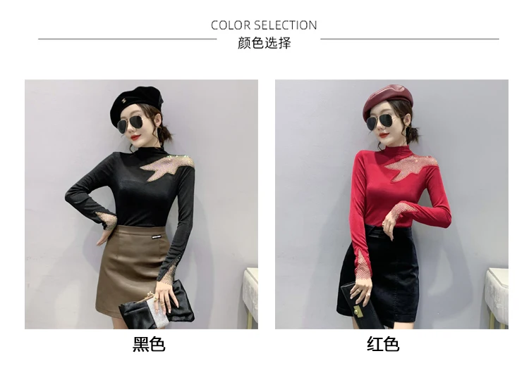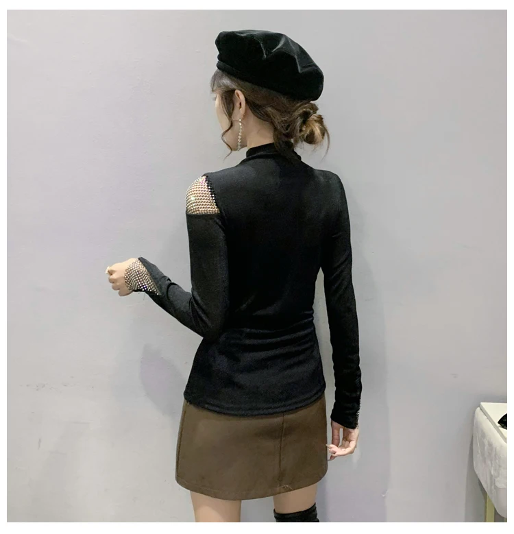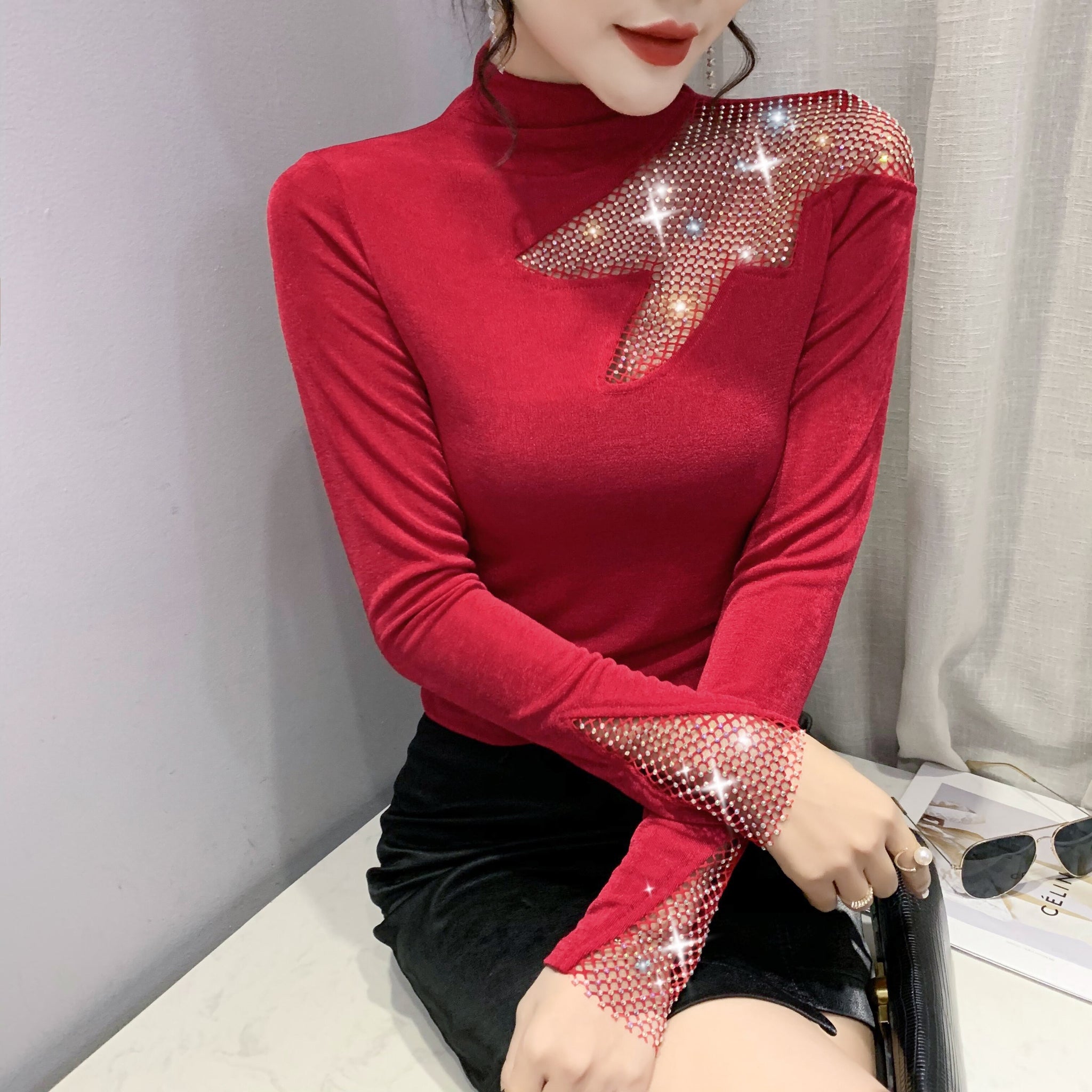 Autumn Winter New 2021 Women's Tops Shirt Fashion Sexy Hollow Out Diamonds Long Sleeve Mesh T-Shirt Plus Size Female Clothing