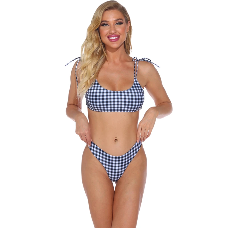 Bikini Plus Size Women's Swimwear Swimsuit Sports Grid Printing Thin Sling High Waist Sexy U Neckline