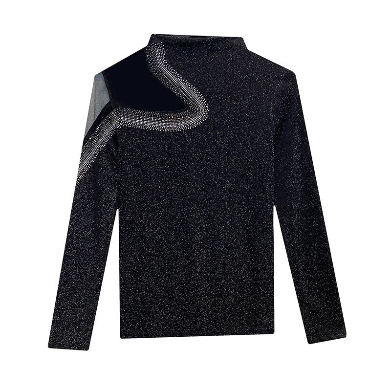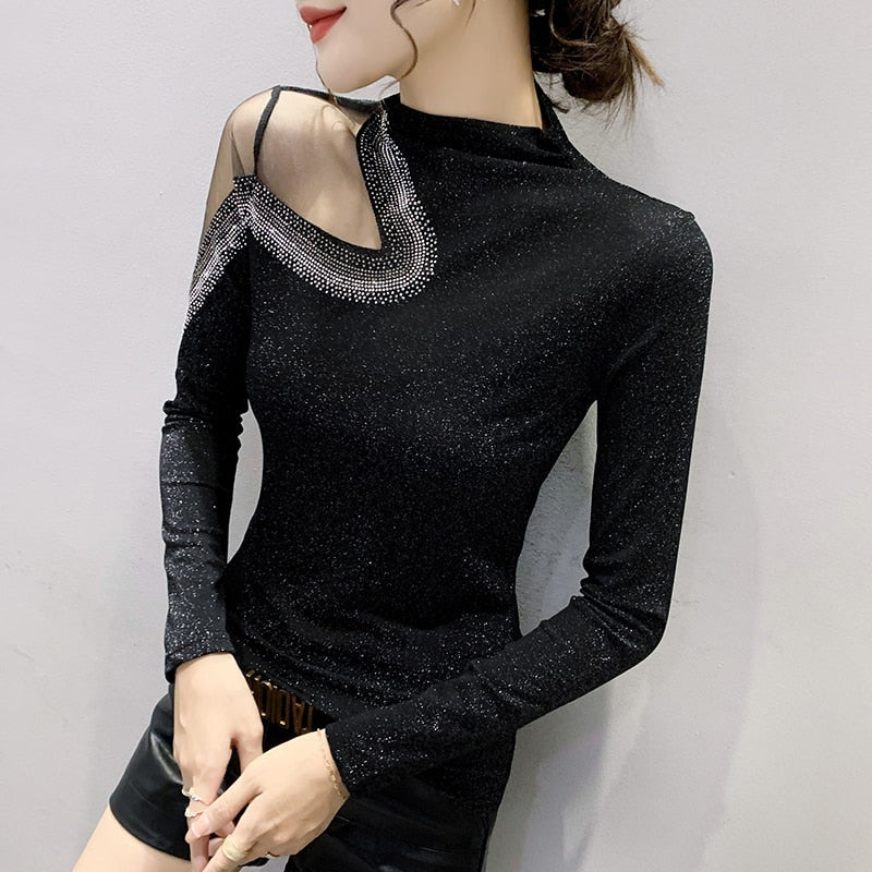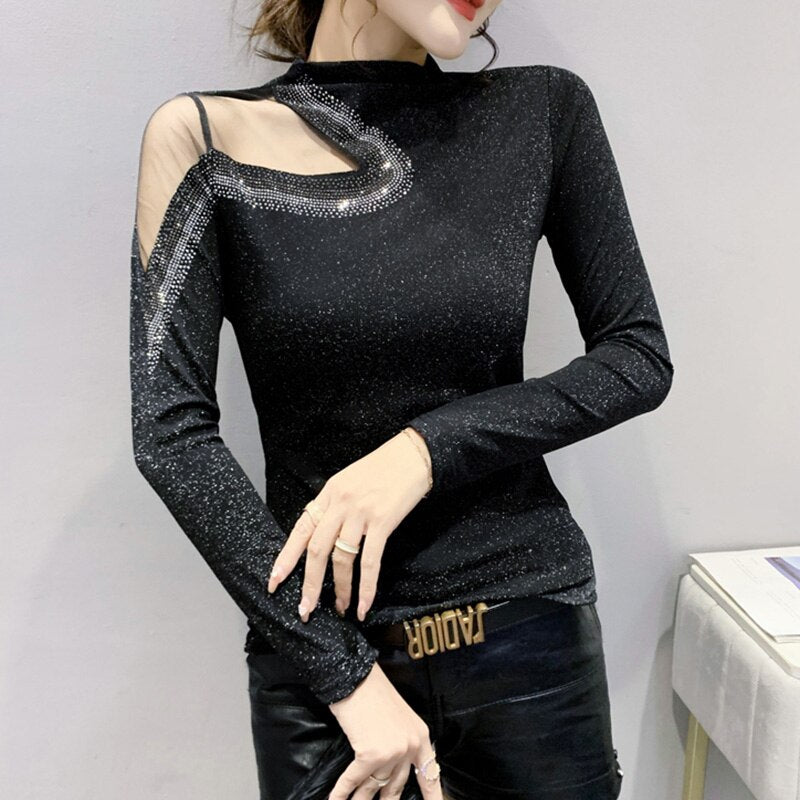 Black Long-Sleeved Turtleneck Women's T-Shirt New 2021 Autumn Winter Hollow Out Diamonds Mesh Tops Plus Size Clothing