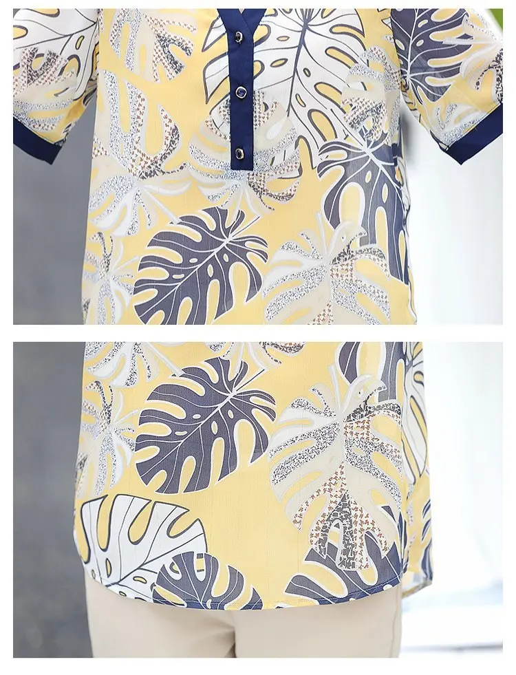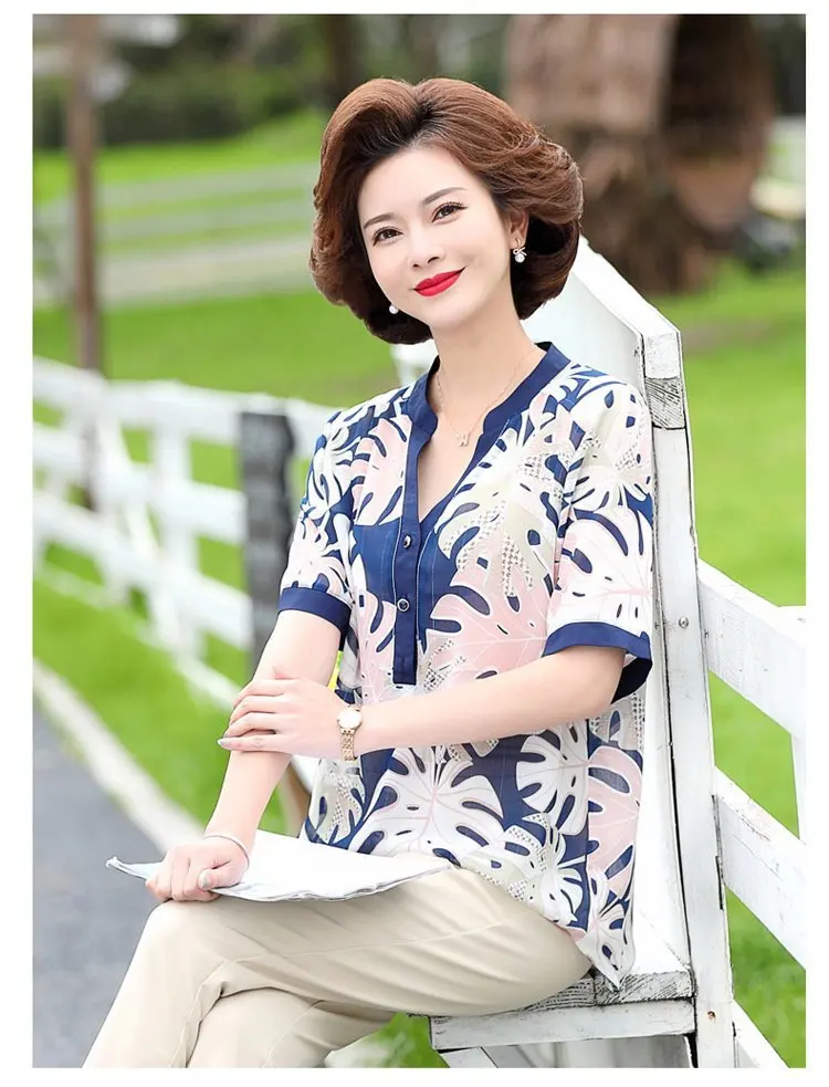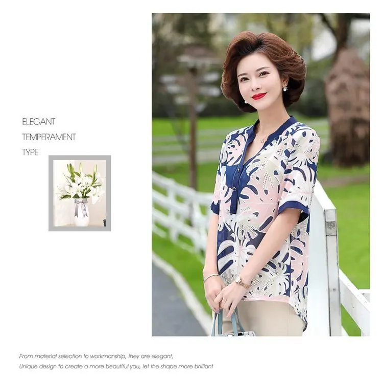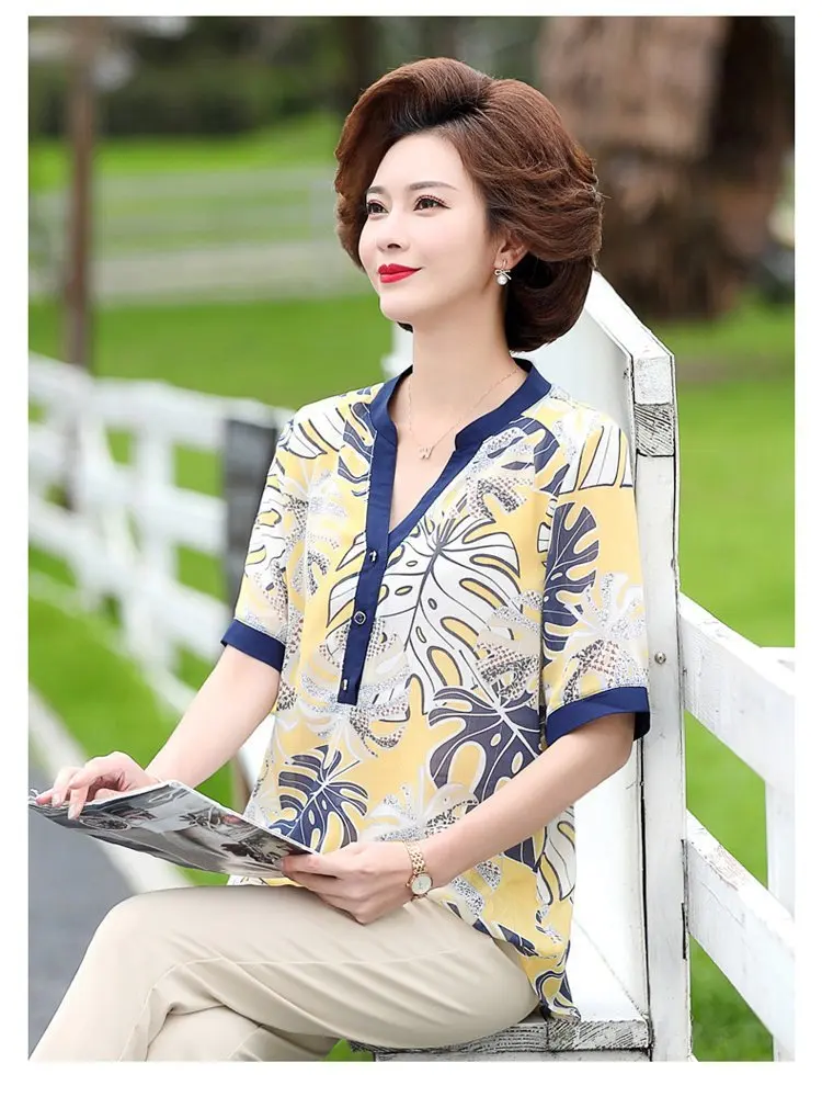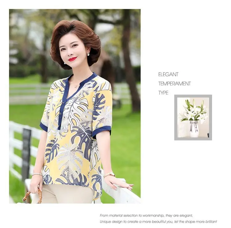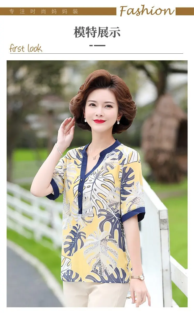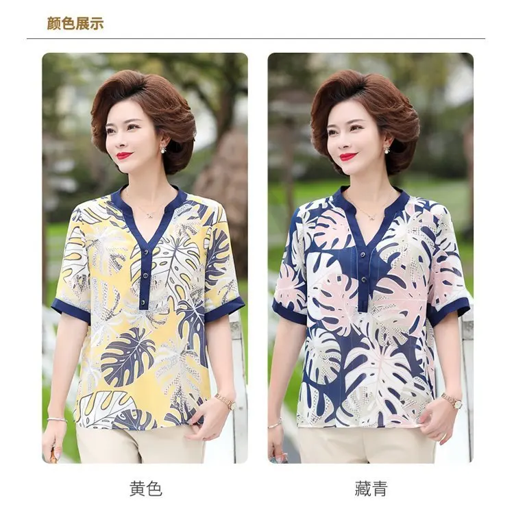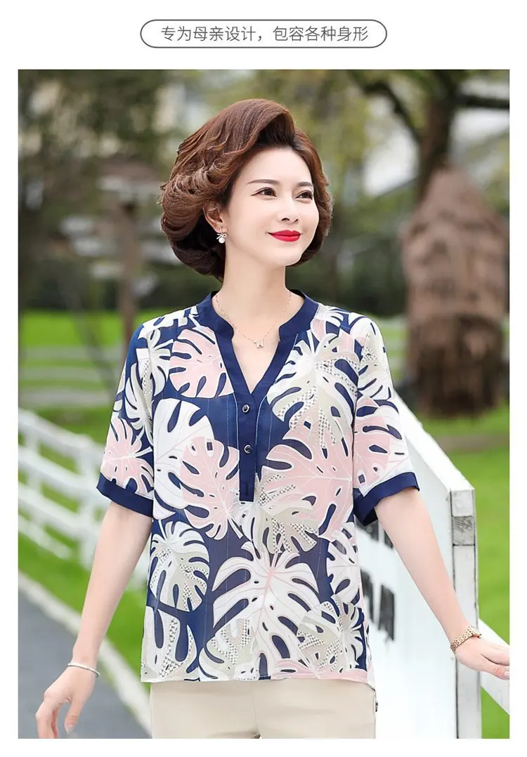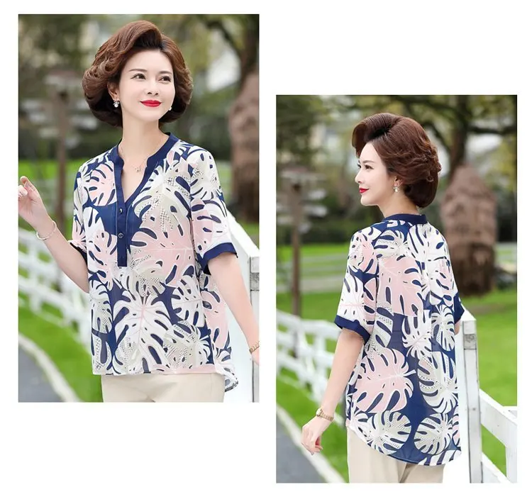 Chiffon Shirt Pullover Summer Middle-Aged Mother Top 2021 New Short Sleeve Women'S Clothing Plus Size Loose Printed Blouse Tee