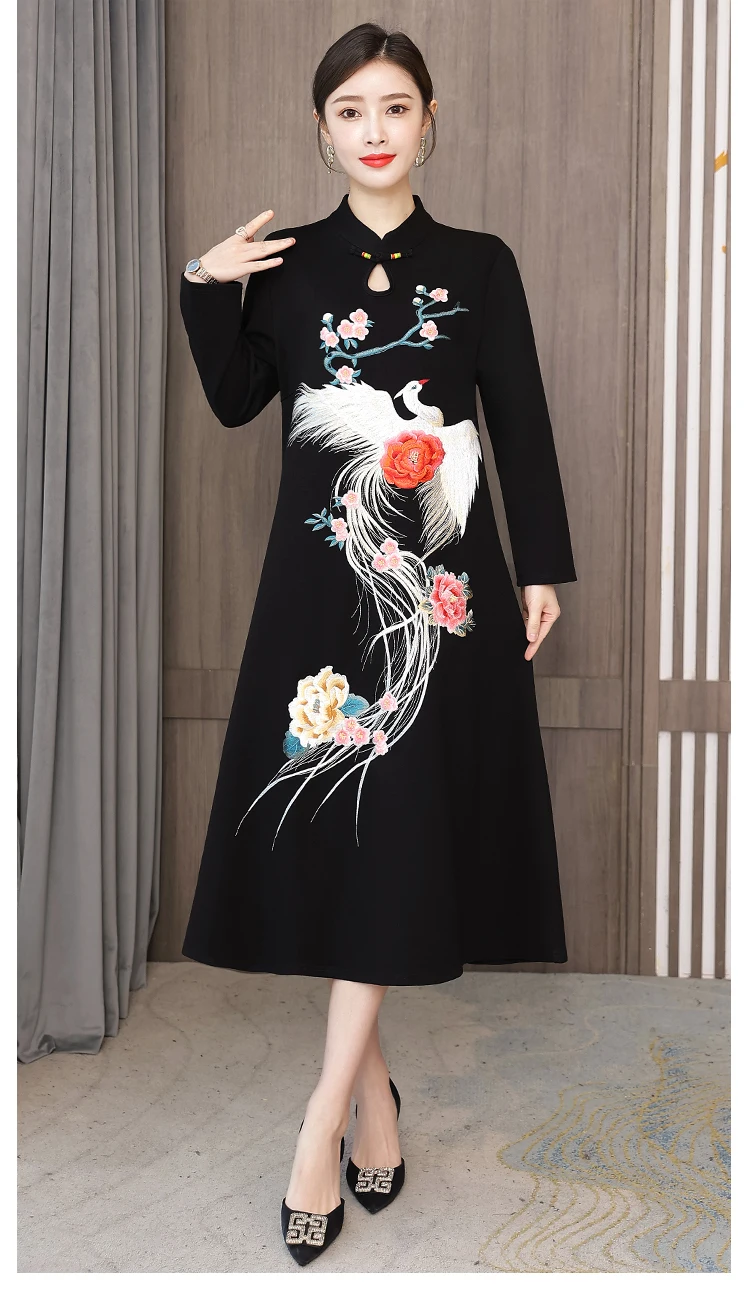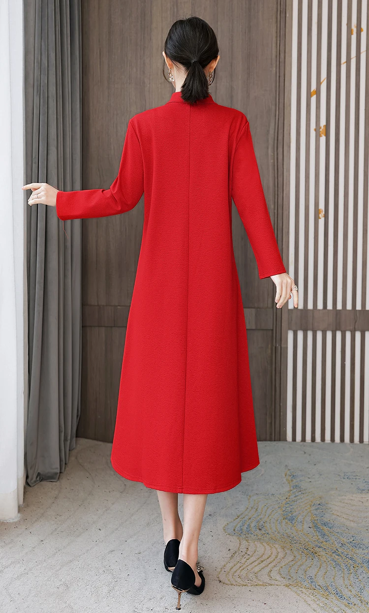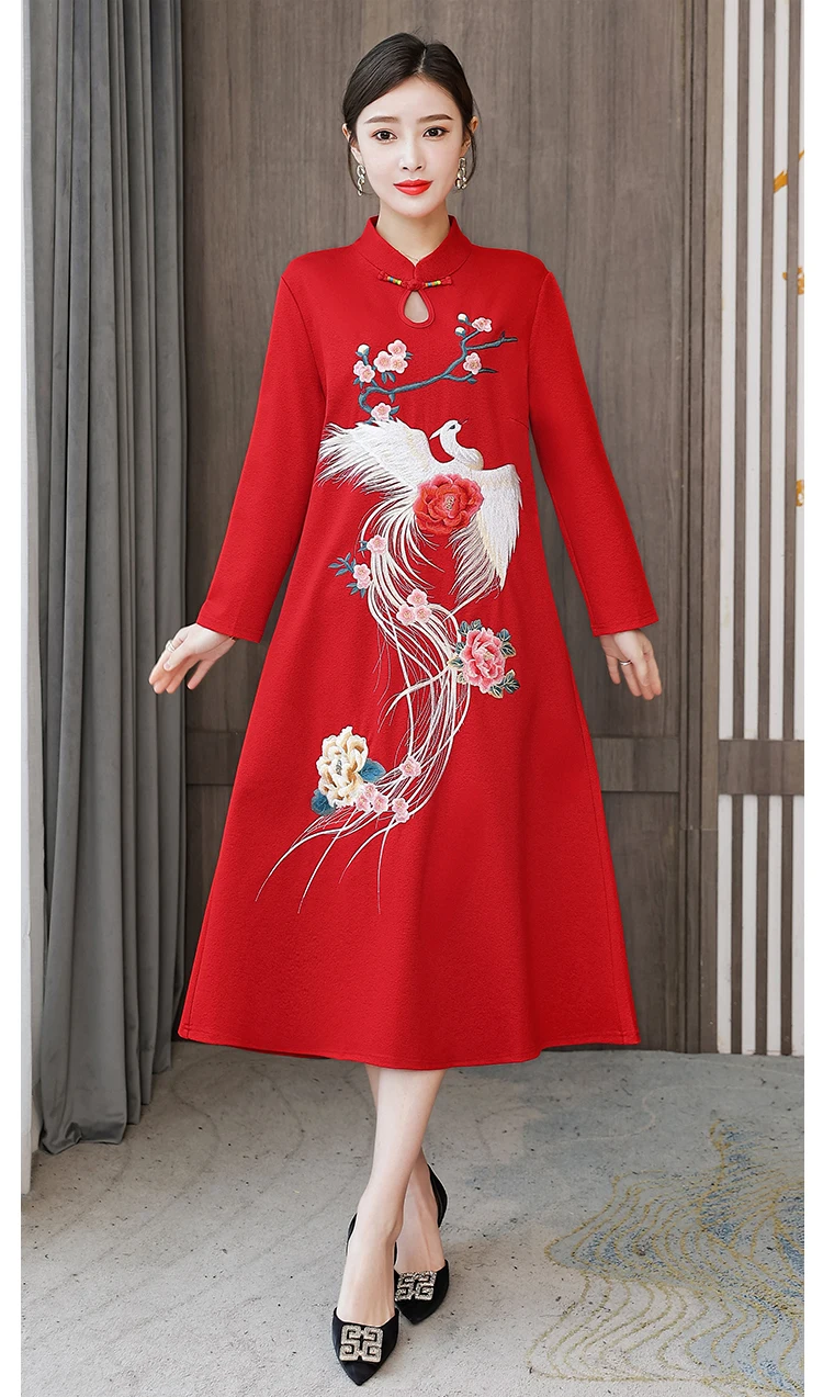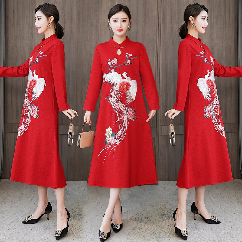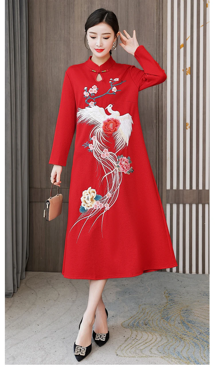 Chinese Style Embroidery Stand Collar Improved Cheongsam Women Autumn Long Sleeve Plus Size Loose Red New Year Midi Dress Female