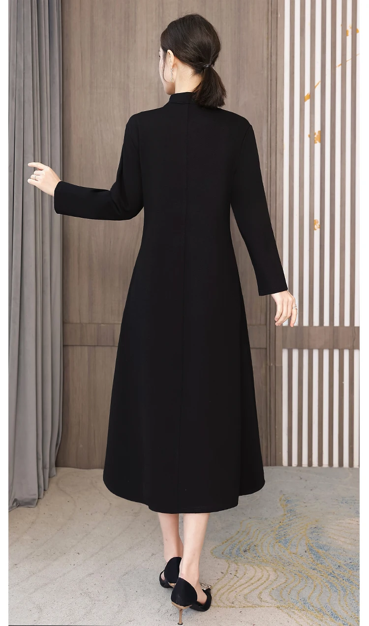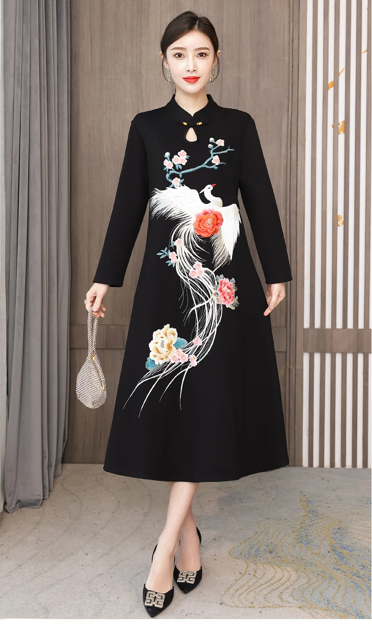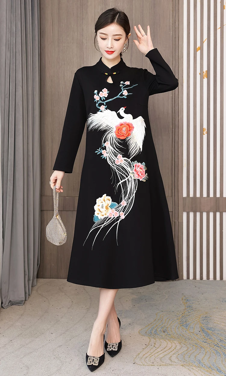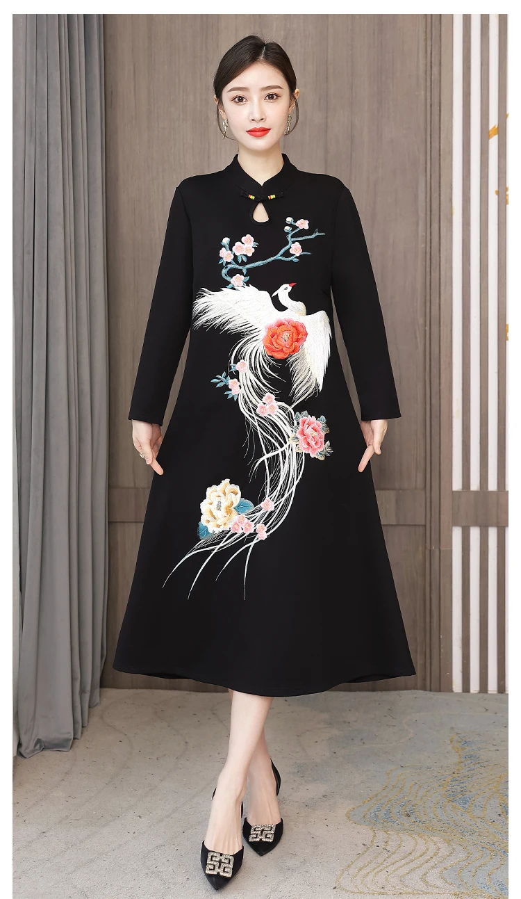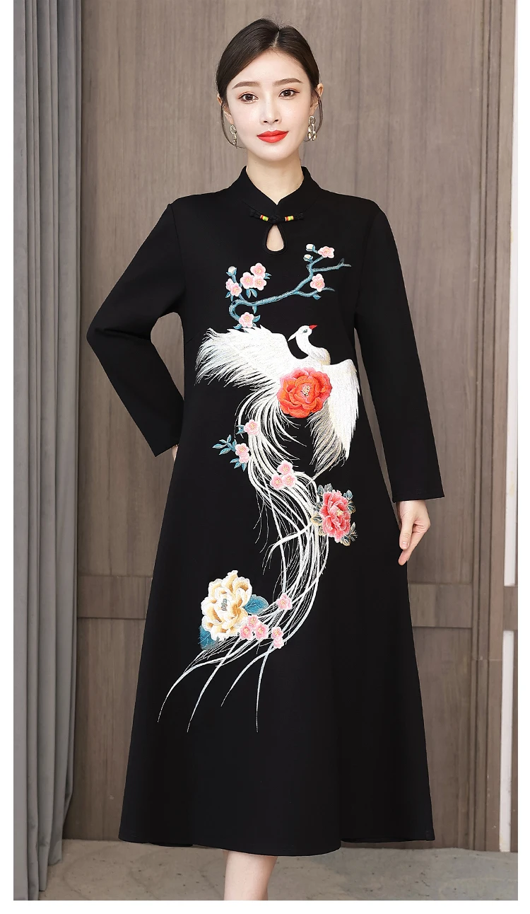 Chinese Style Embroidery Stand Collar Improved Cheongsam Women Autumn Long Sleeve Plus Size Loose Red New Year Midi Dress Female