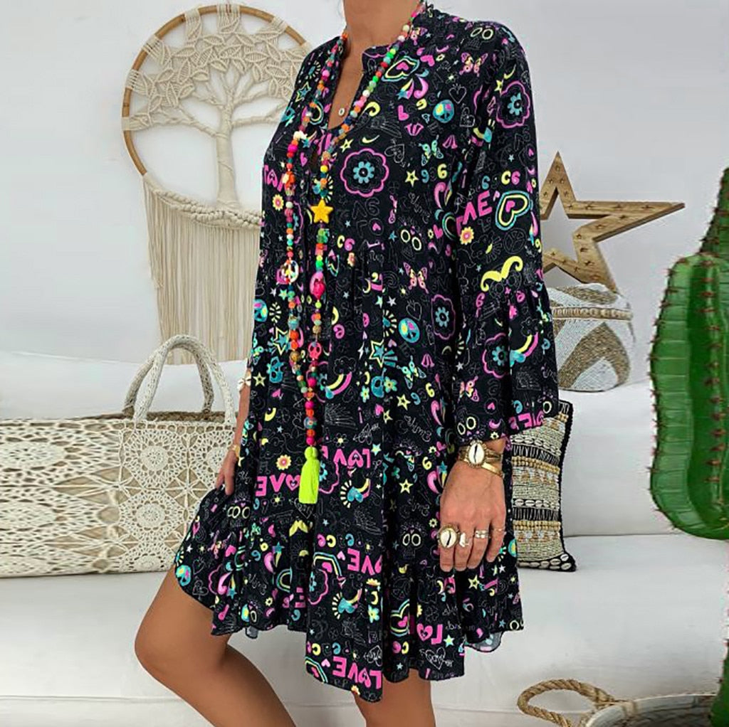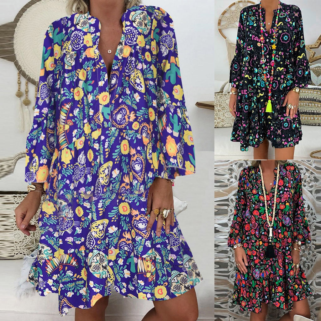Women's Ladies Plus Size Loose Print Long Sleeve V-Collar Button Mini Dress
