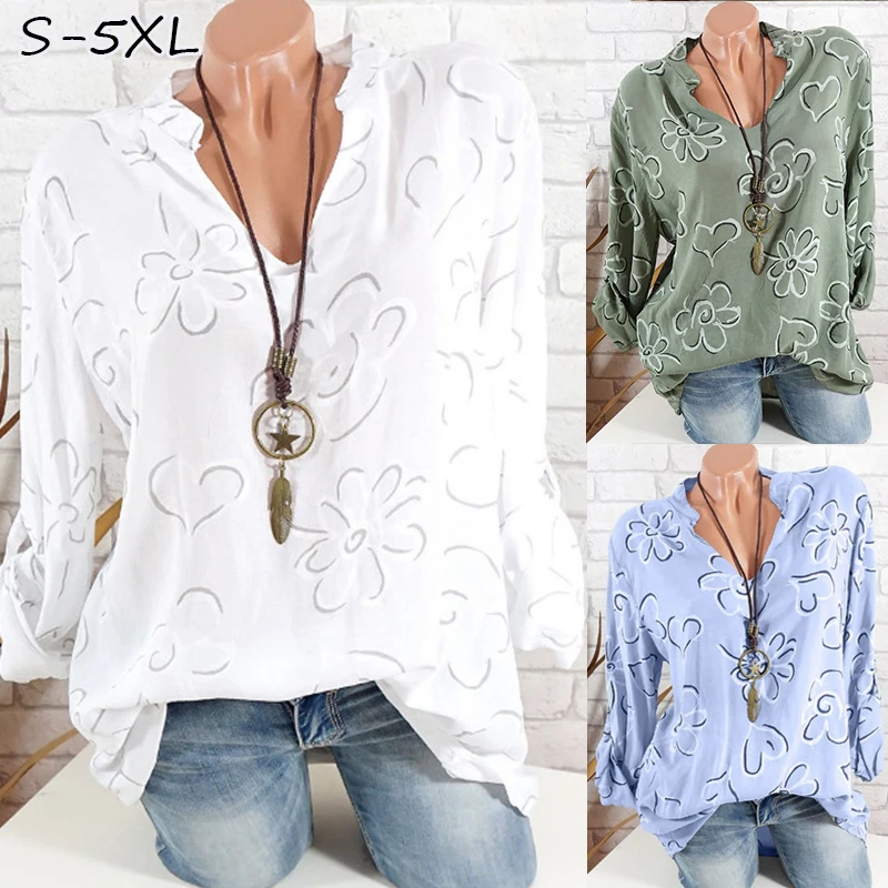 Fashion Women Printing Long Sleeve Shirt Loose V-neck Blouse Autumn Plus Size Blouses Shirts