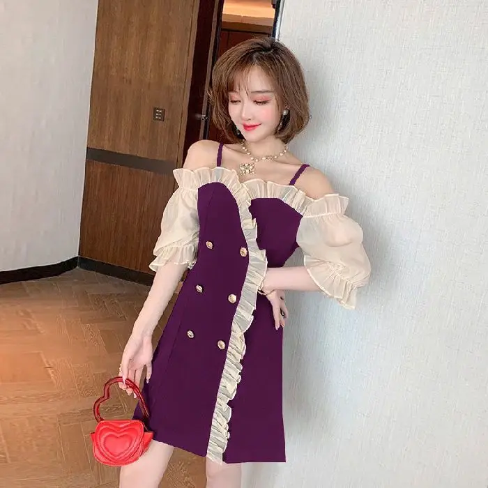 Korean Summer Women's Dress Sexy Bare Shoulder spliced ruffles mini Dress Women Double Breasted Casual plus size suspender dress