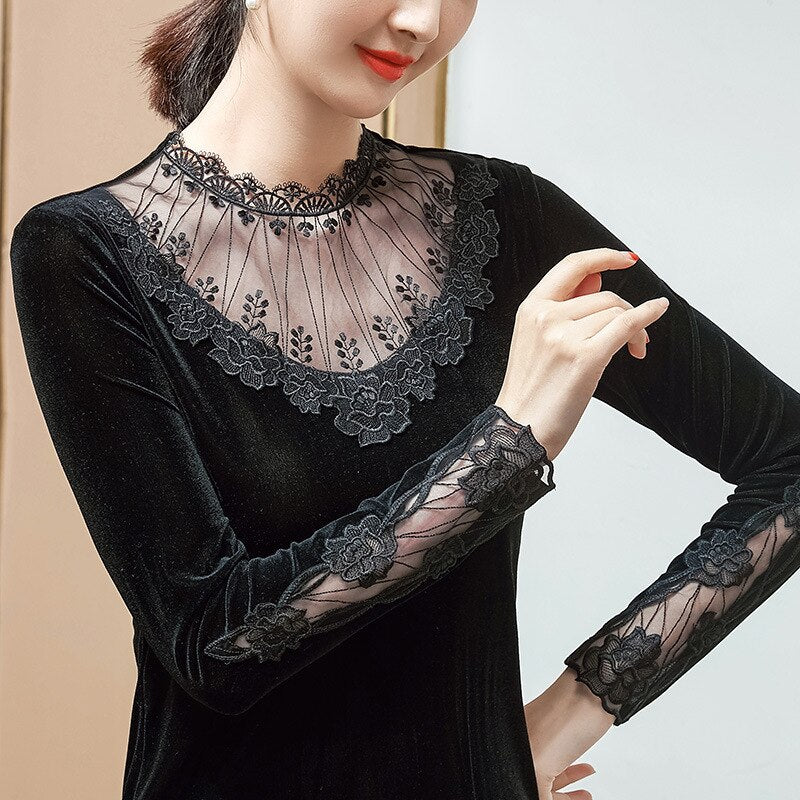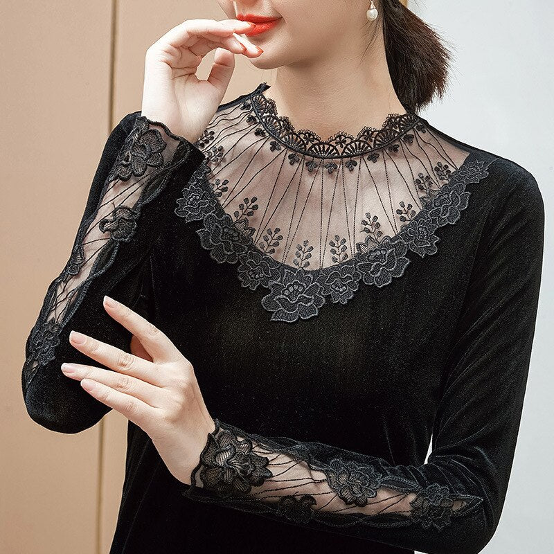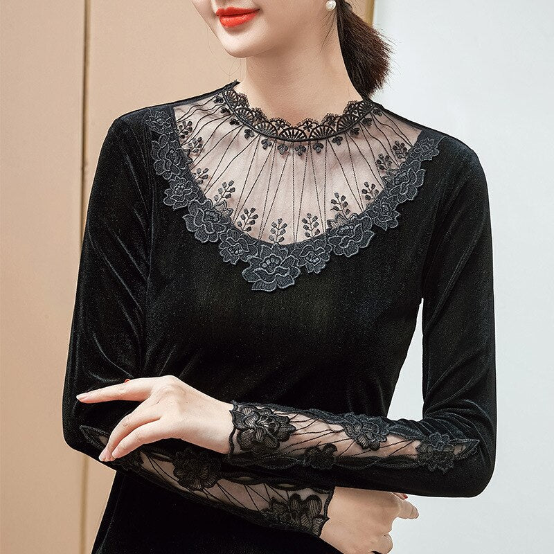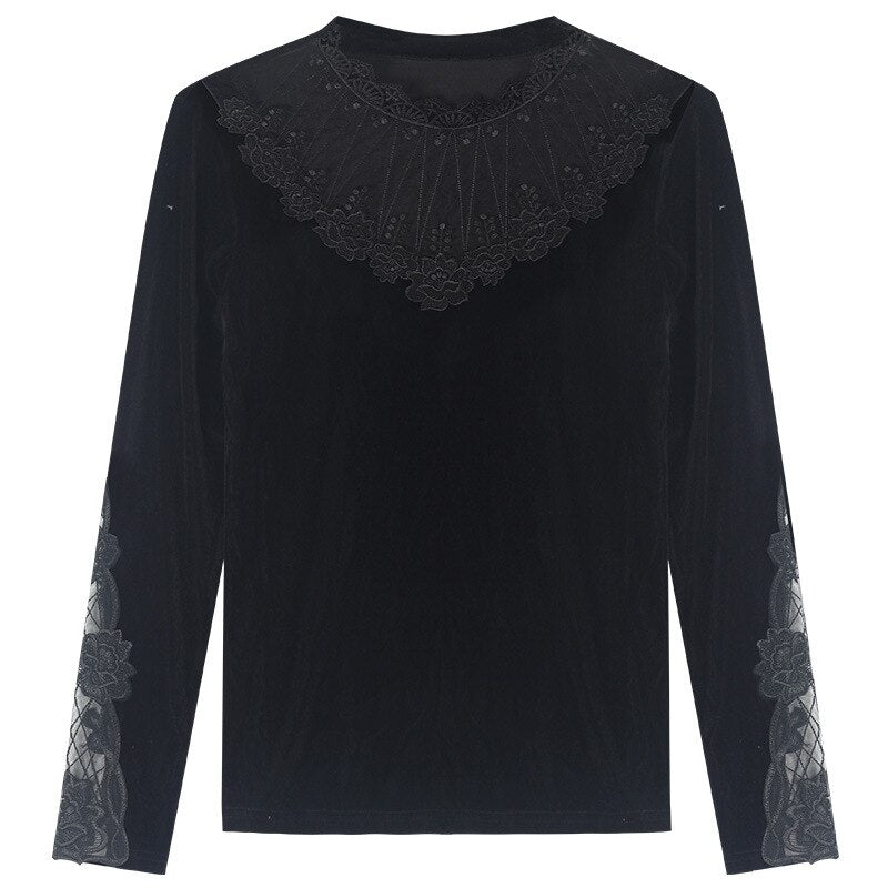 Lace Embroidery Stitching Velvet T-Shirt New 2021 Autumn Winter Long Sleeve Black Women's Tops Plus Size M-4XL Lady Shirt