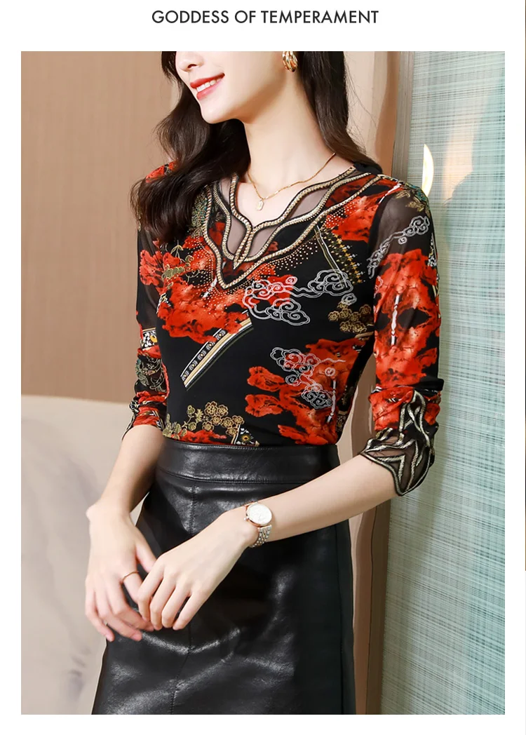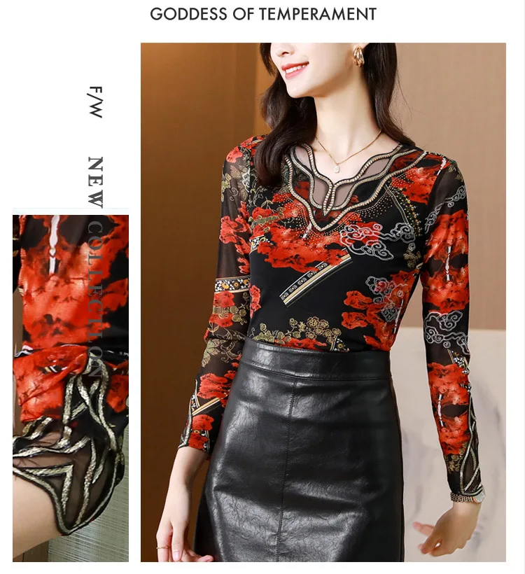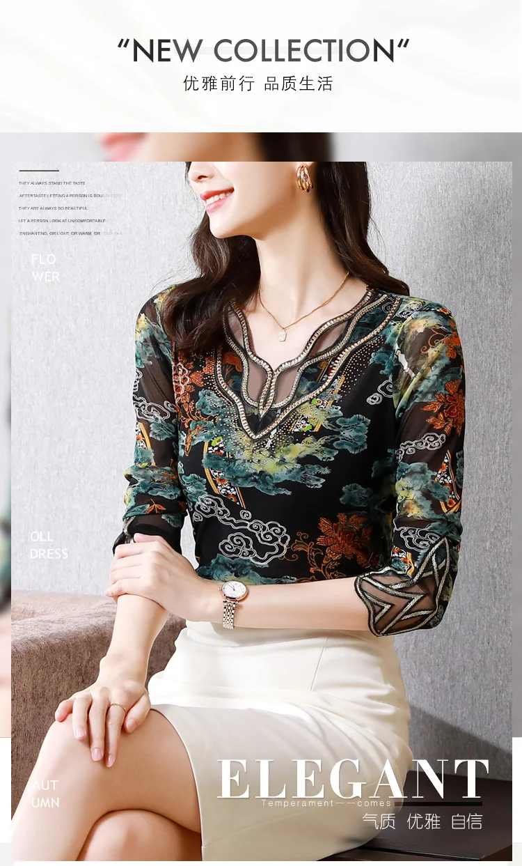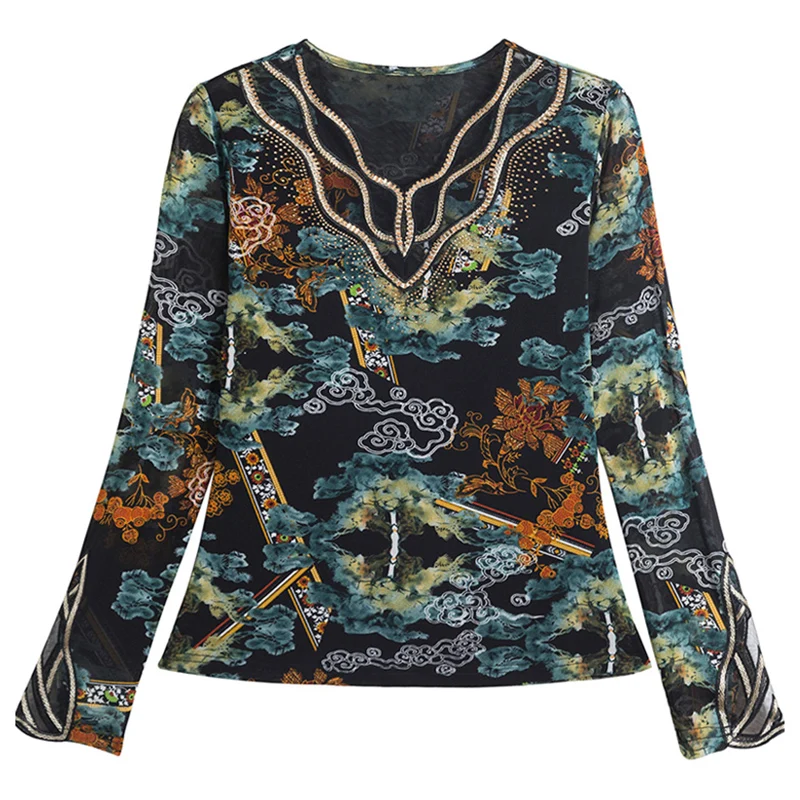 M-3XL Plus Size Women Clothing New 2021 Autumn Long Sleeve V-Neck Hot drilling Mesh Tops Plus Size T-Shirt