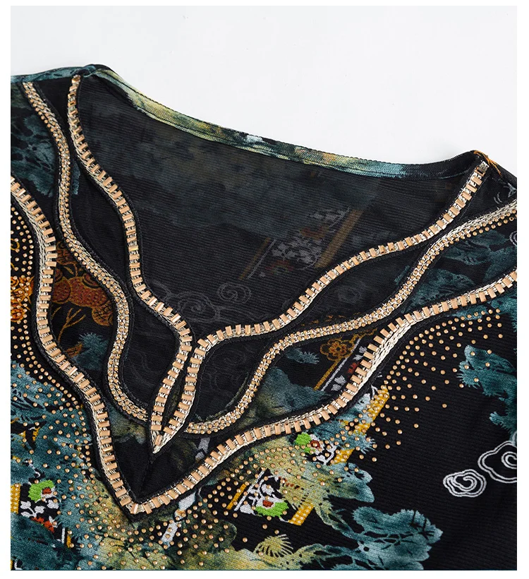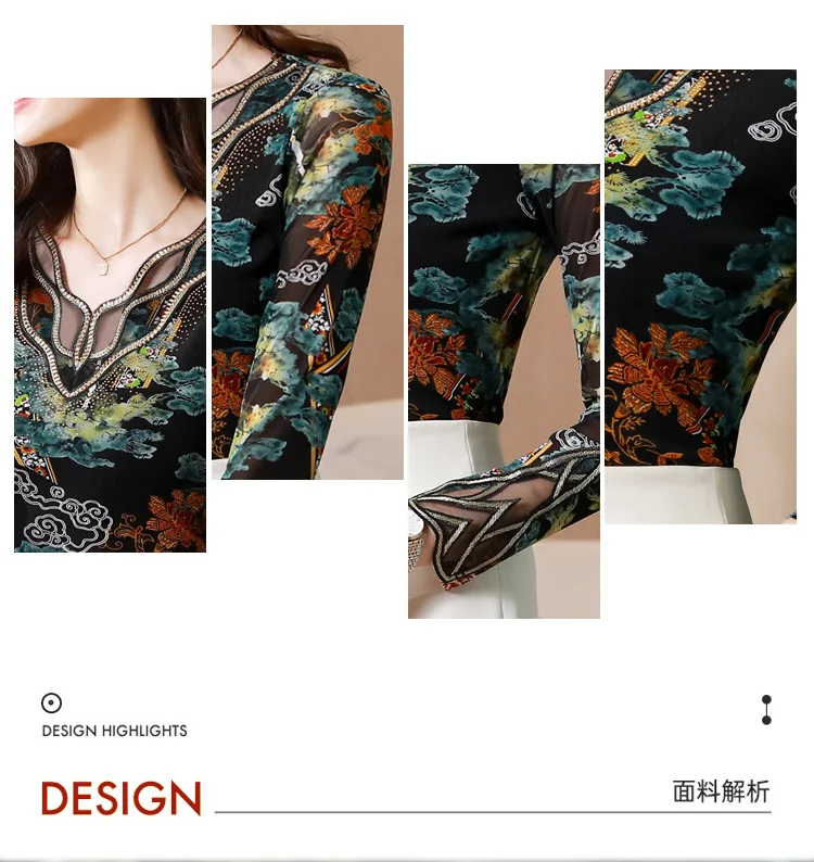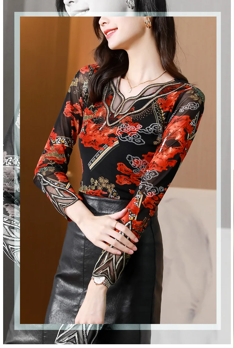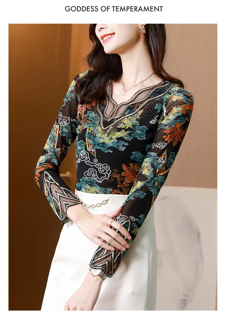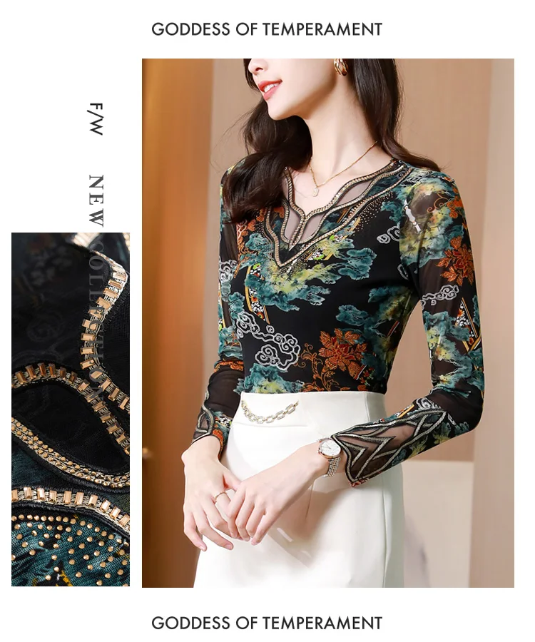 M-3XL Plus Size Women Clothing New 2021 Autumn Long Sleeve V-Neck Hot drilling Mesh Tops Plus Size T-Shirt