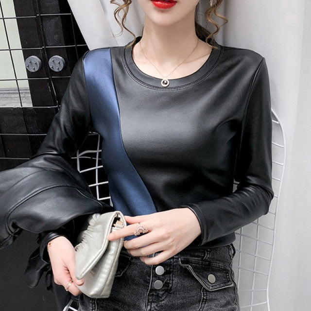 New 2020 Autumn Winter Womtn Tops Fashion Casual Long Sleeve PU Leather Thick Velvet T-Shirt Plus Size Women's Tops