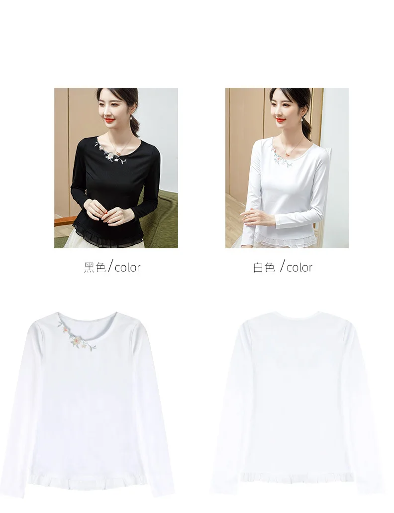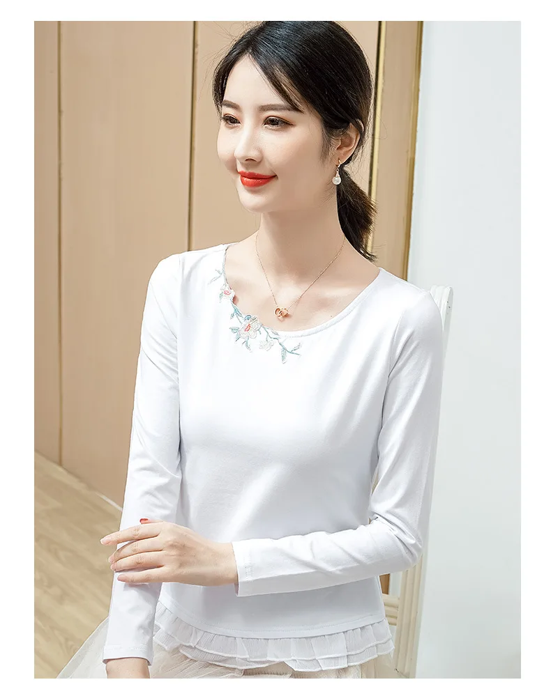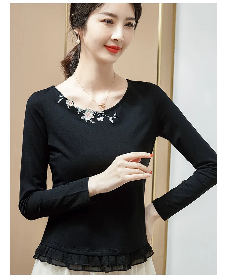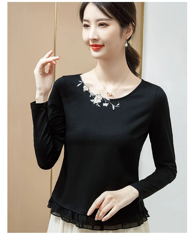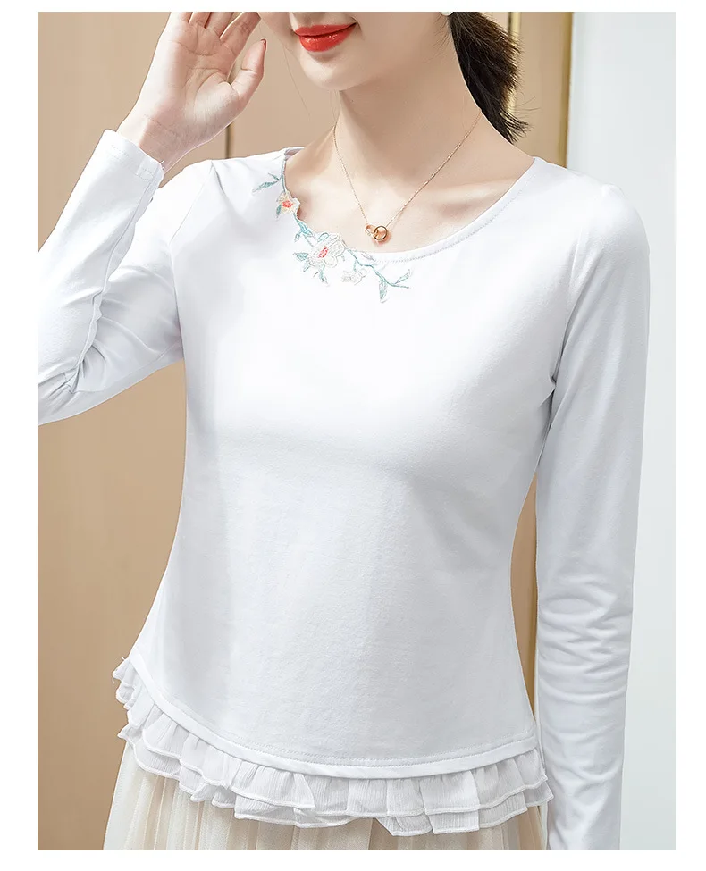 New 2021 Autumn Long Sleeve Women's T-Shirt Fashion Casual Embroidered Cotton Tops Plus Size M-4XL Ruffles Shirt