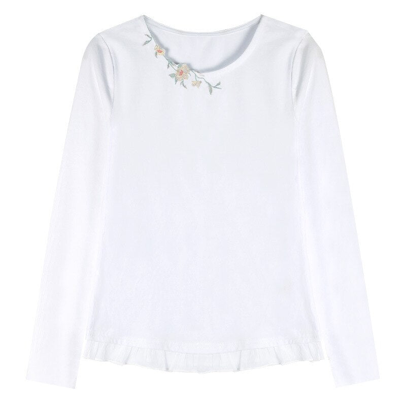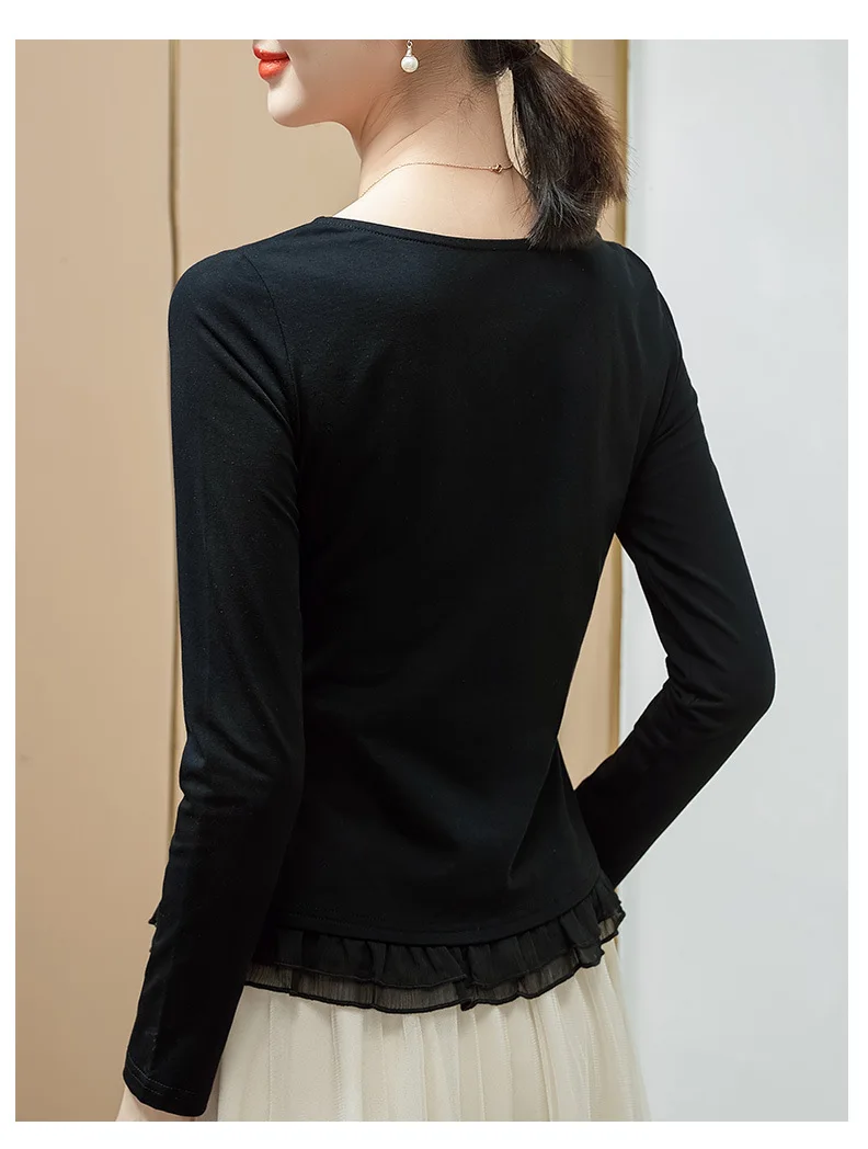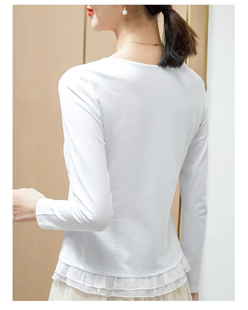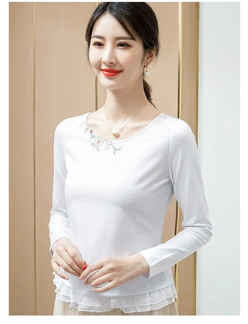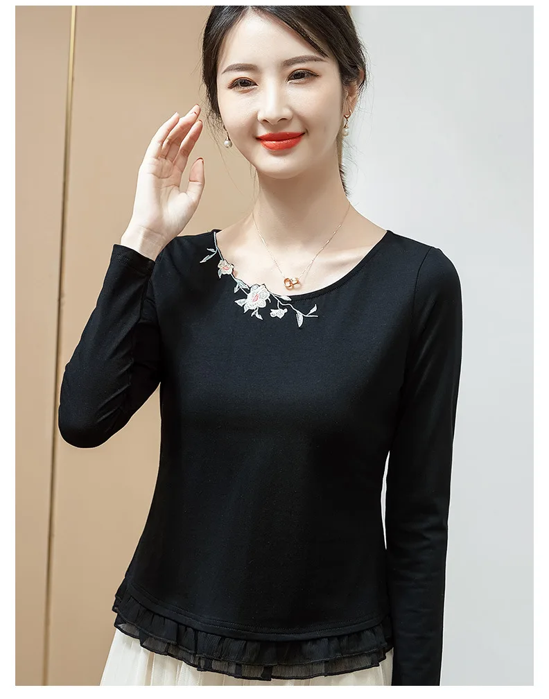 New 2021 Autumn Long Sleeve Women's T-Shirt Fashion Casual Embroidered Cotton Tops Plus Size M-4XL Ruffles Shirt