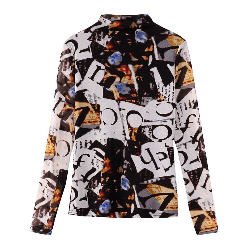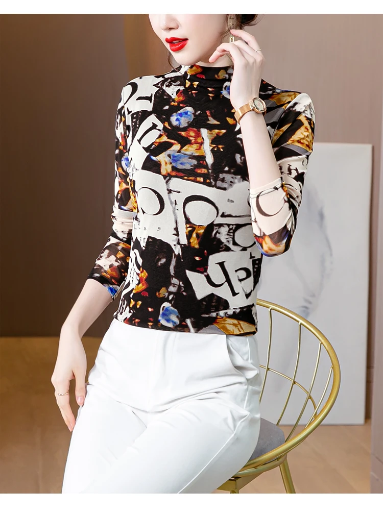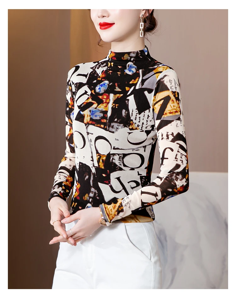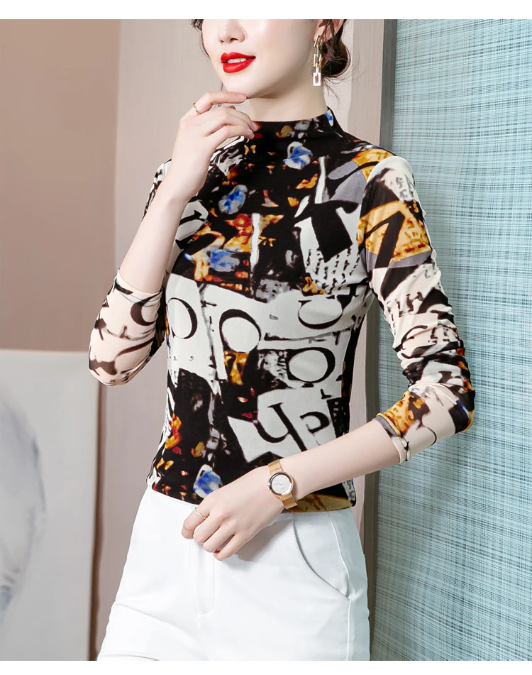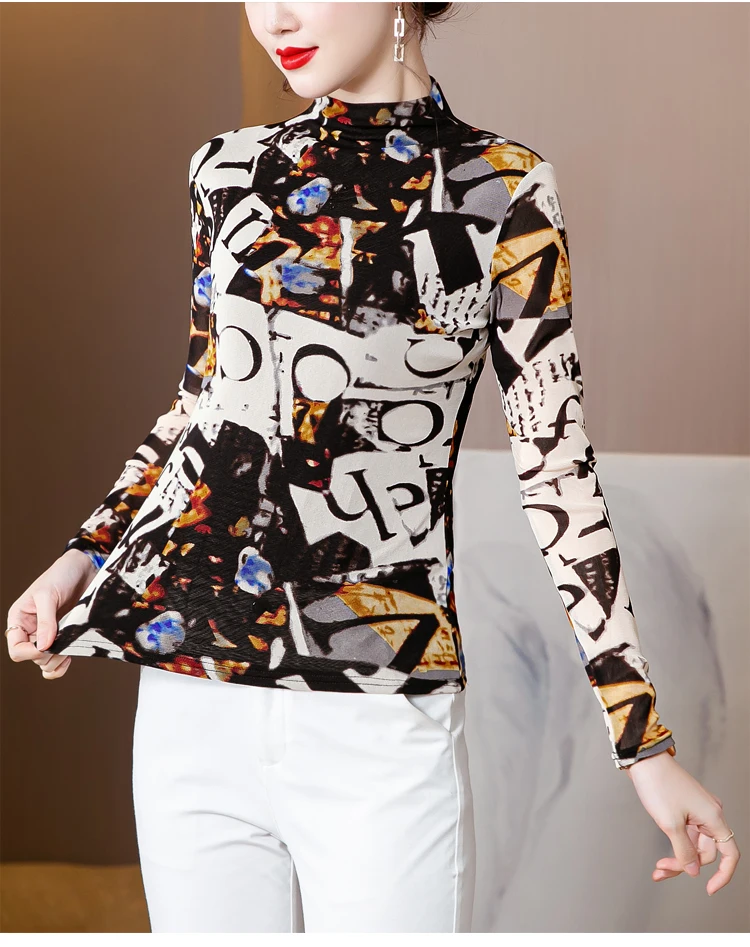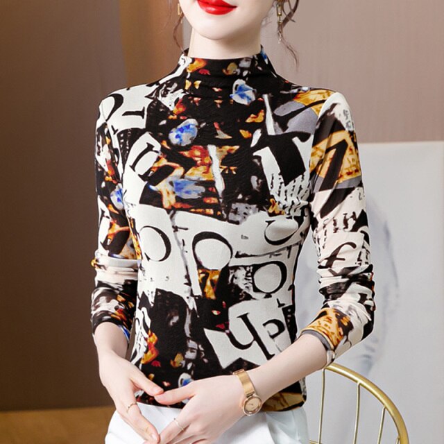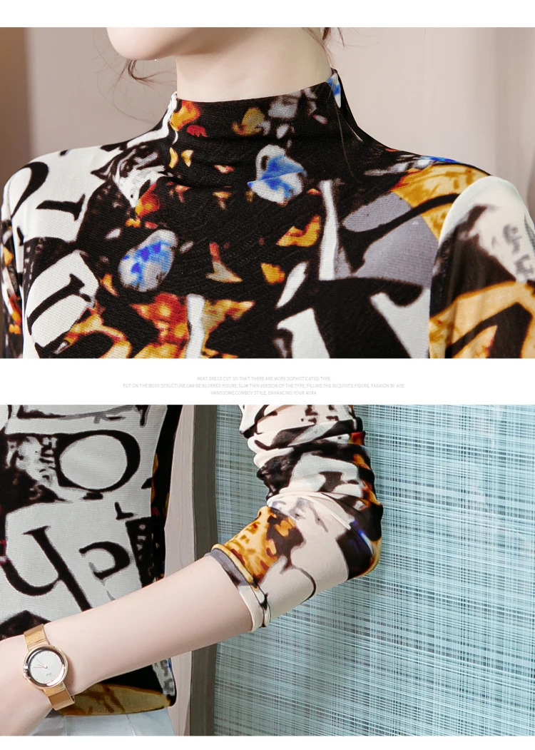 New 2021 Autumn Winter Women's Tops Fashion Printed Long Sleeve Turtleneck Mesh T-Shirt M-4XL Plus Size Female Shirt