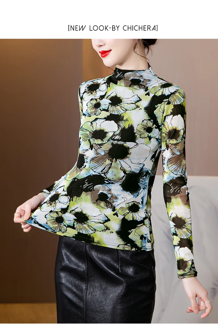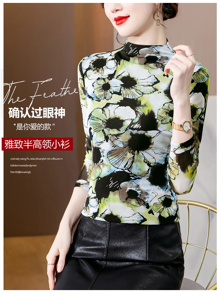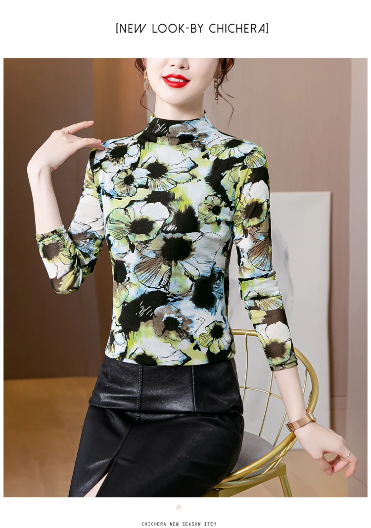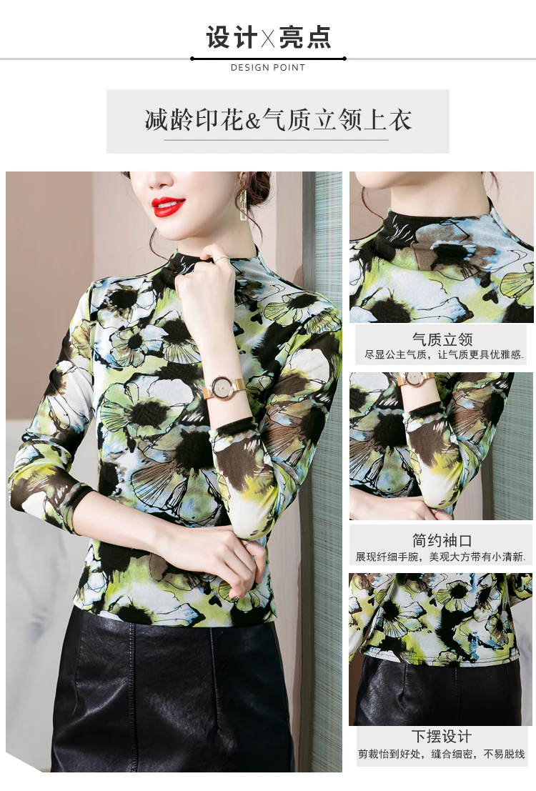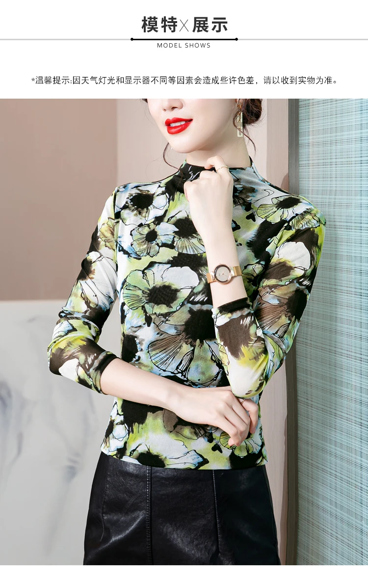 New 2021 Autumn Winter Women's Tops Fashion Printed Long Sleeve Turtleneck Mesh T-Shirt M-4XL Plus Size Female Shirt
