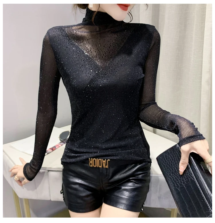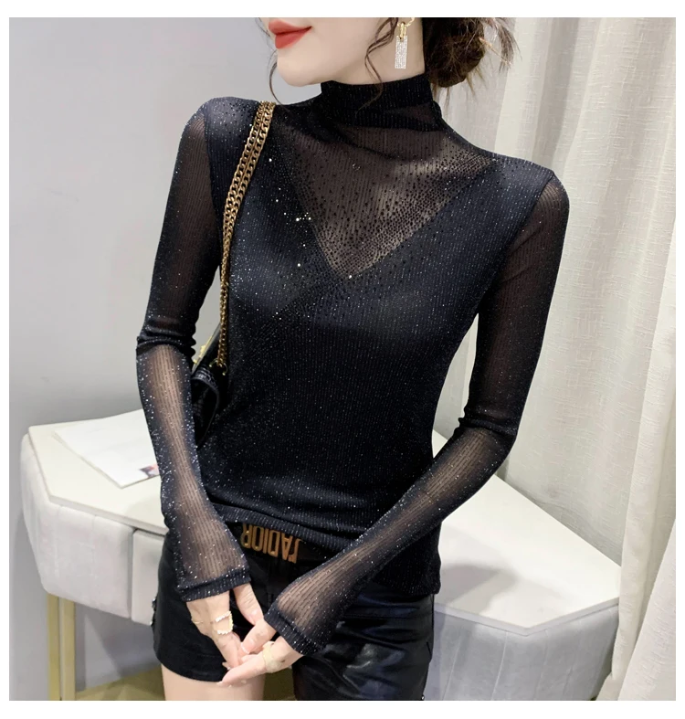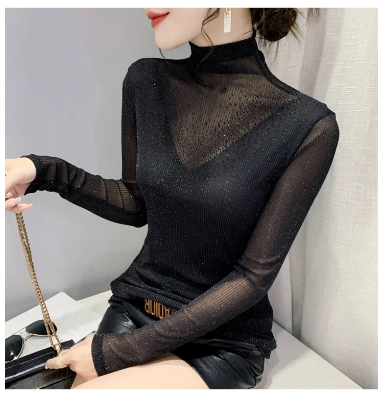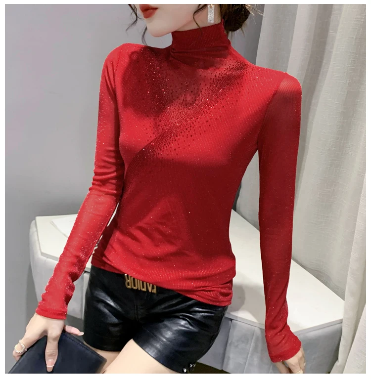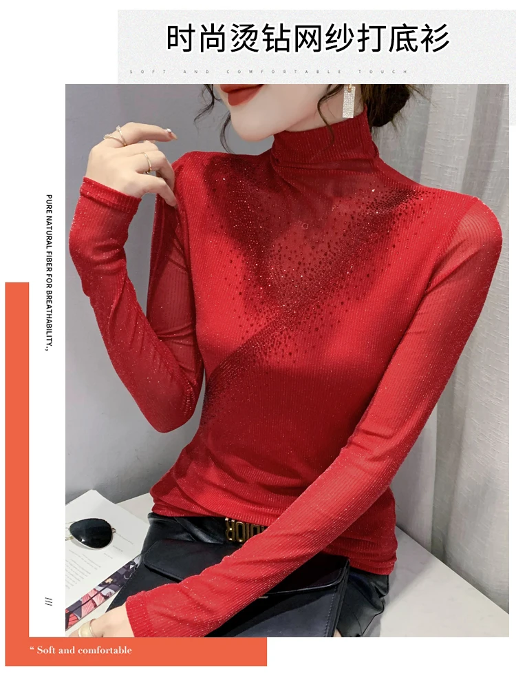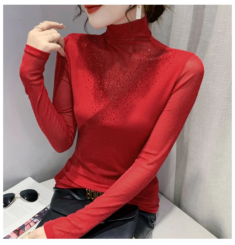New 2021 Autumn Women Clothing Fashion Long Sleeve Turtleneck Hot Drilling Mesh Tops M-3XL Plus Size Women's T-Shirt