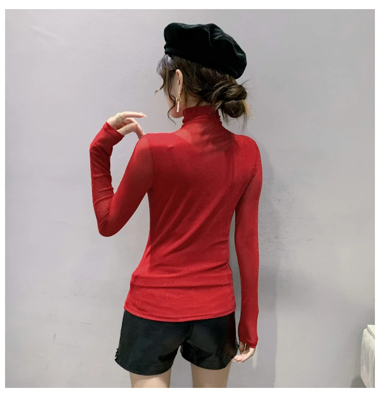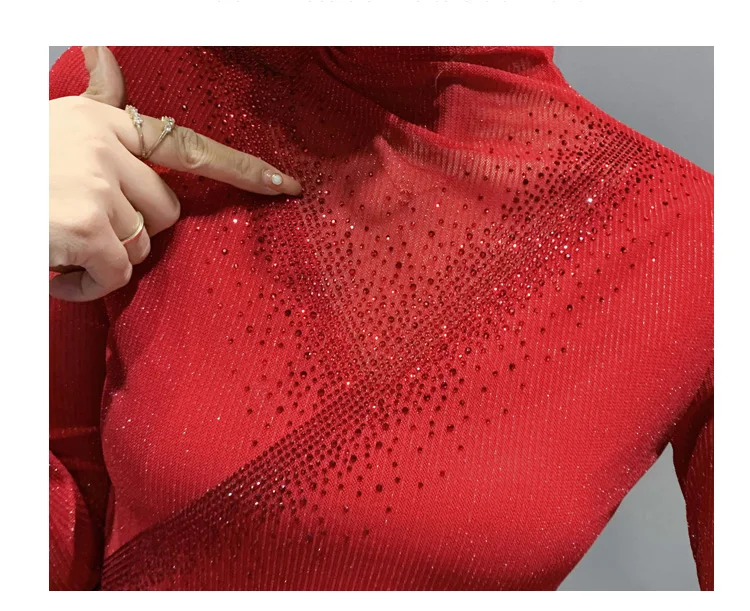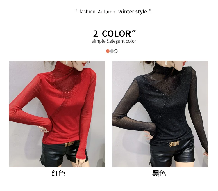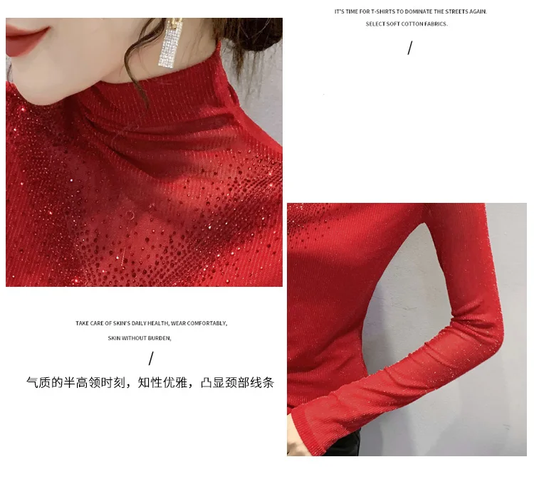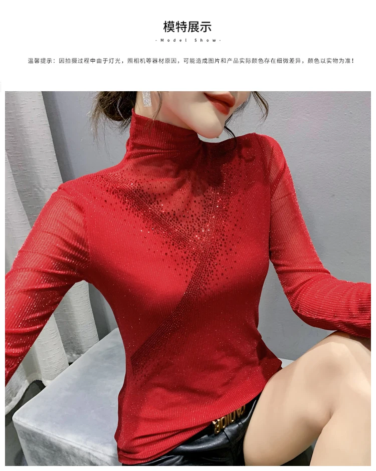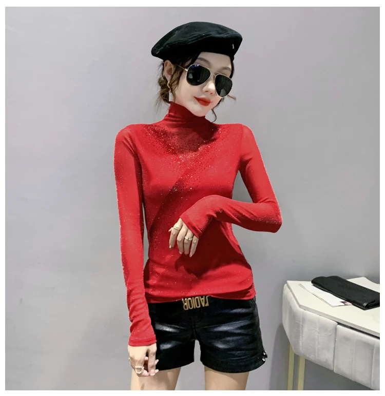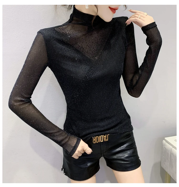 New 2021 Autumn Women Clothing Fashion Long Sleeve Turtleneck Hot Drilling Mesh Tops M-3XL Plus Size Women's T-Shirt