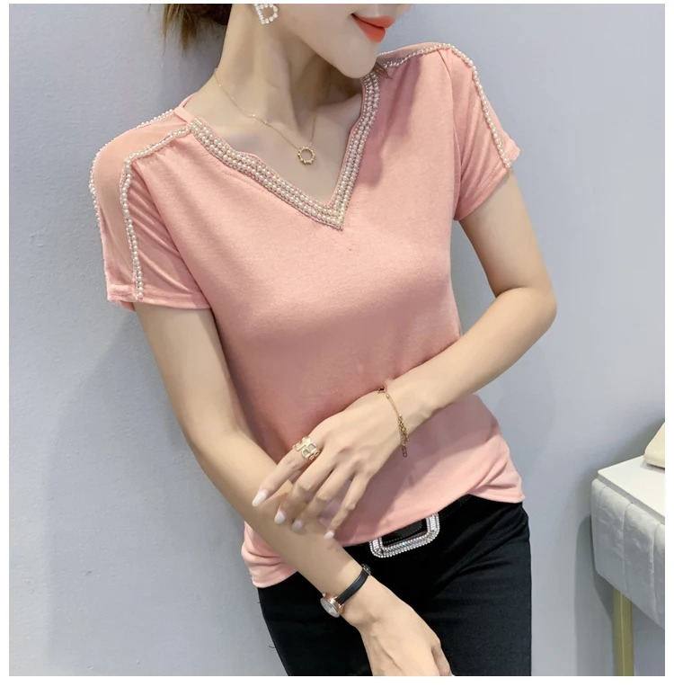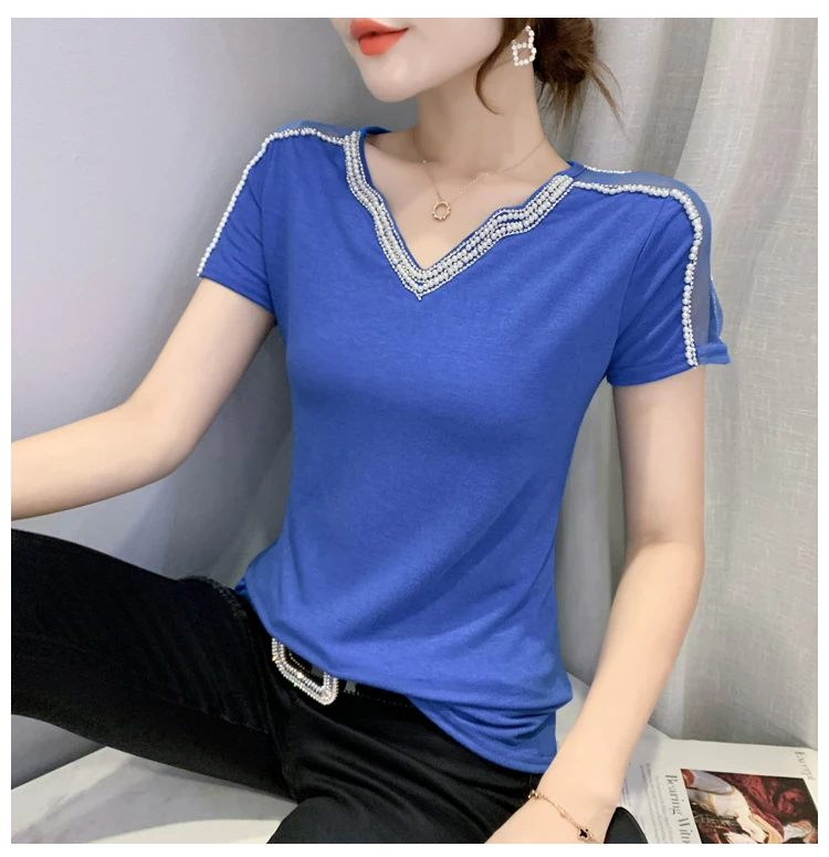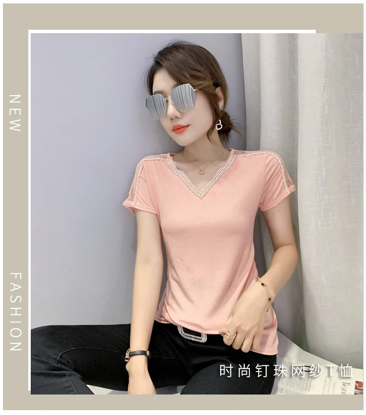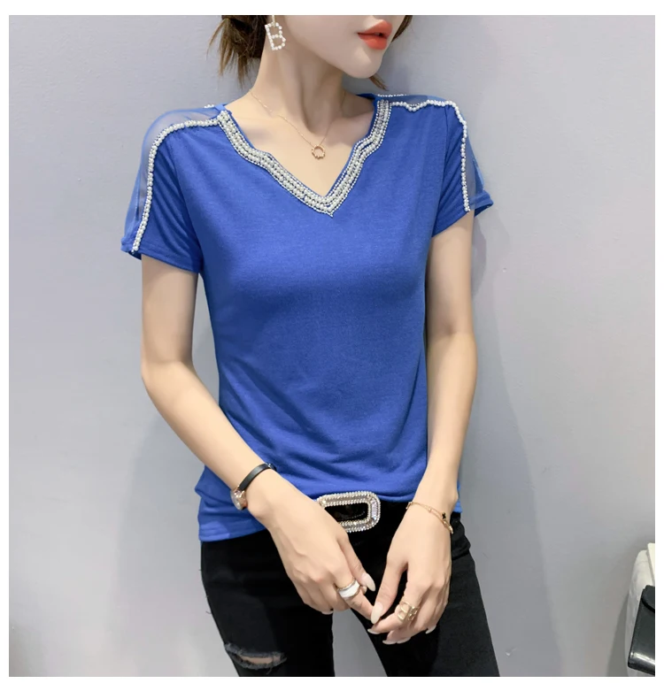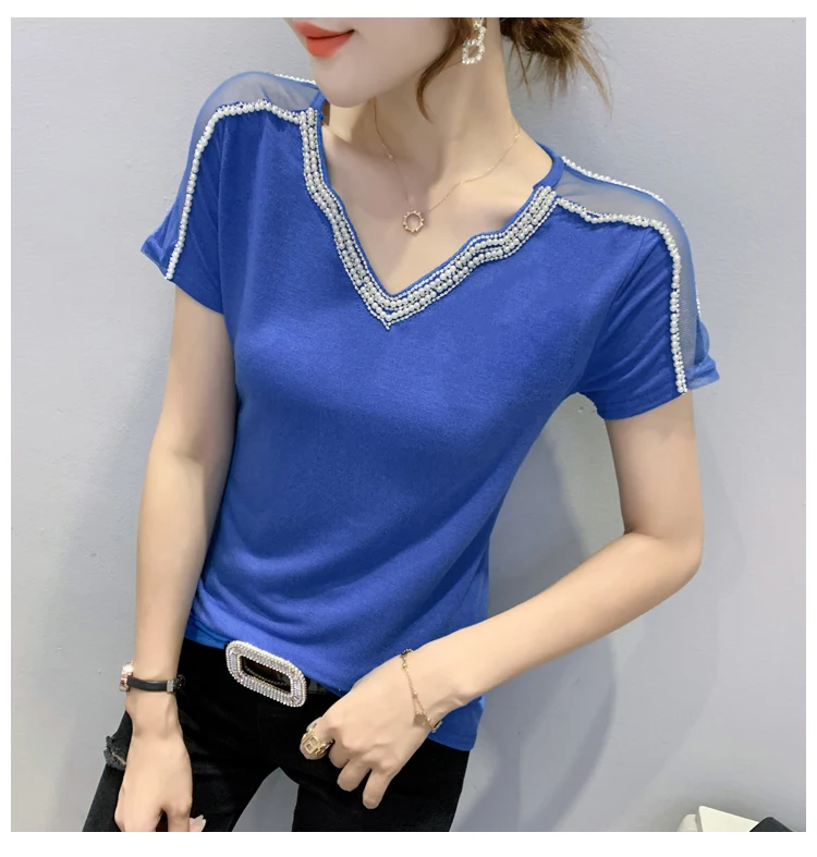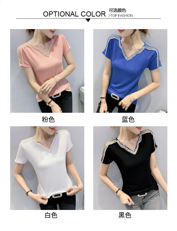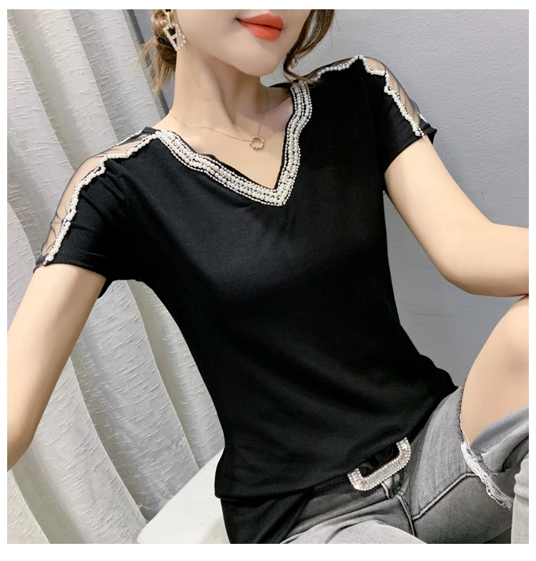 New 2021 Summer Short Sleeve Mesh Tops Fashion Casual Beading Women's T-Shirt Plus Size Lady Blusas Clothes