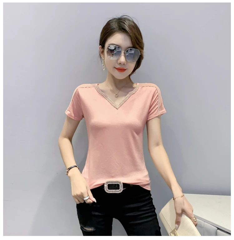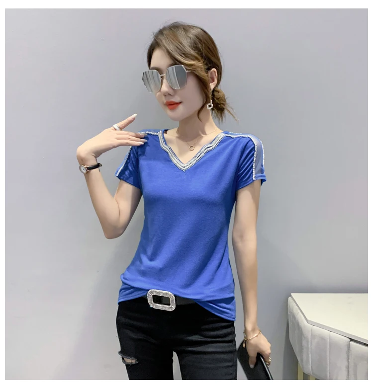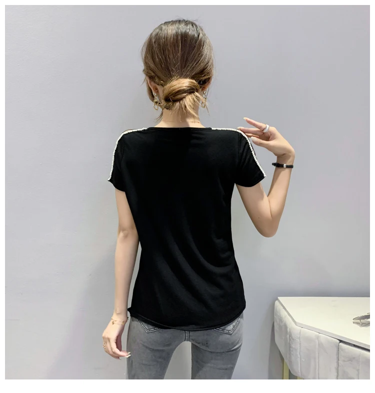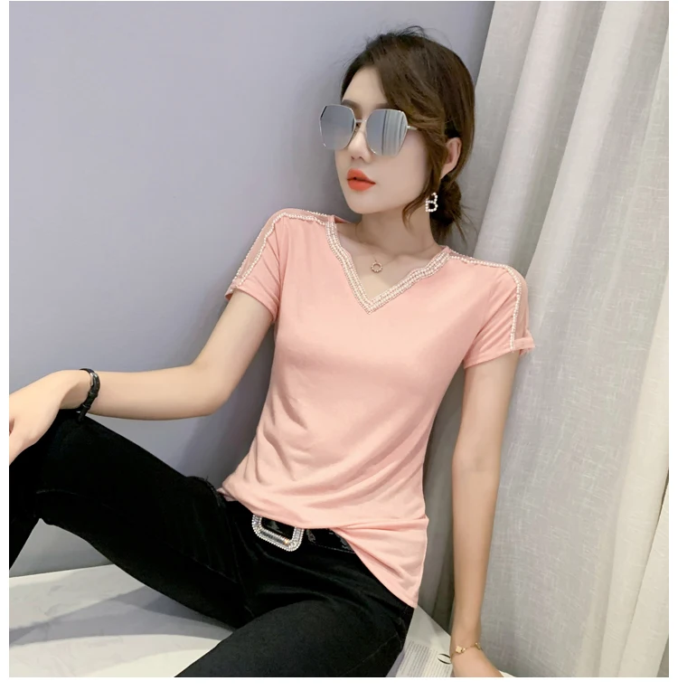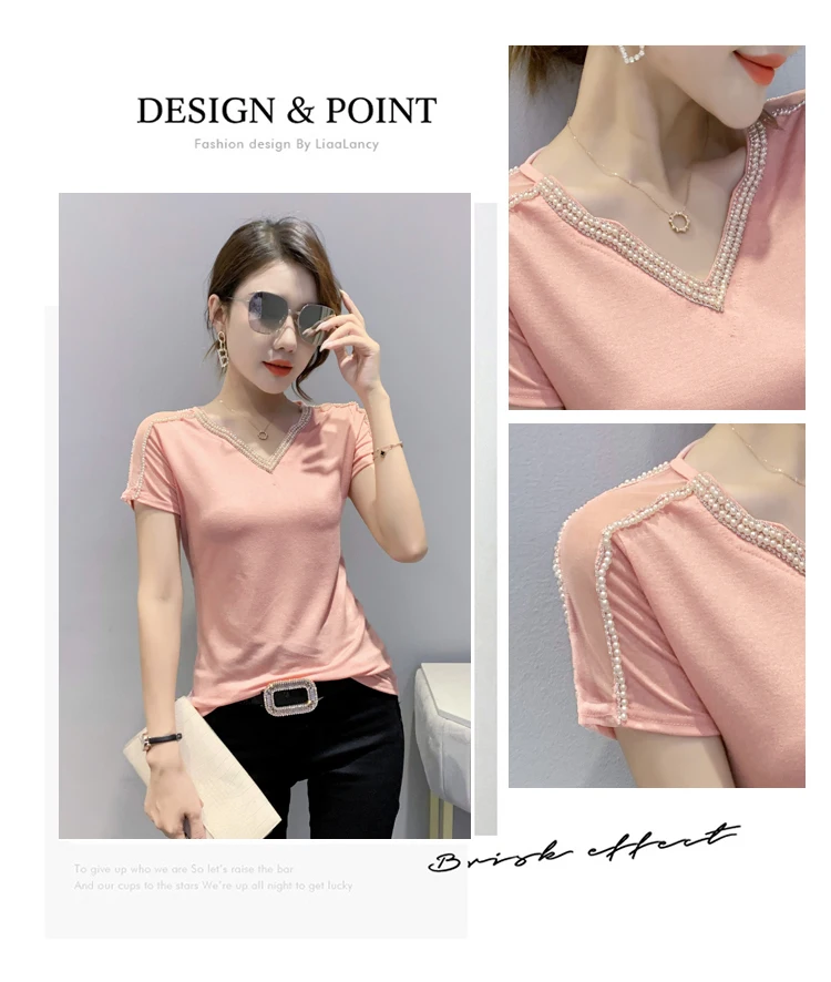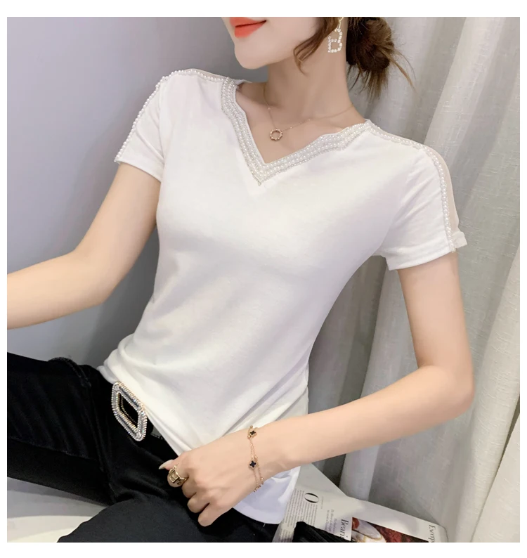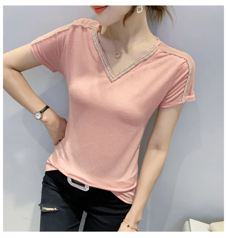 New 2021 Summer Short Sleeve Mesh Tops Fashion Casual Beading Women's T-Shirt Plus Size Lady Blusas Clothes