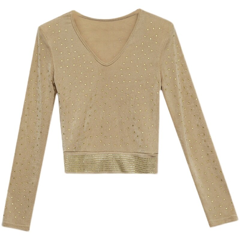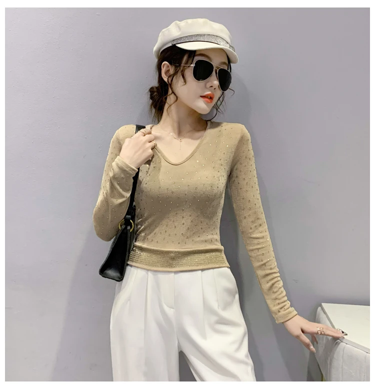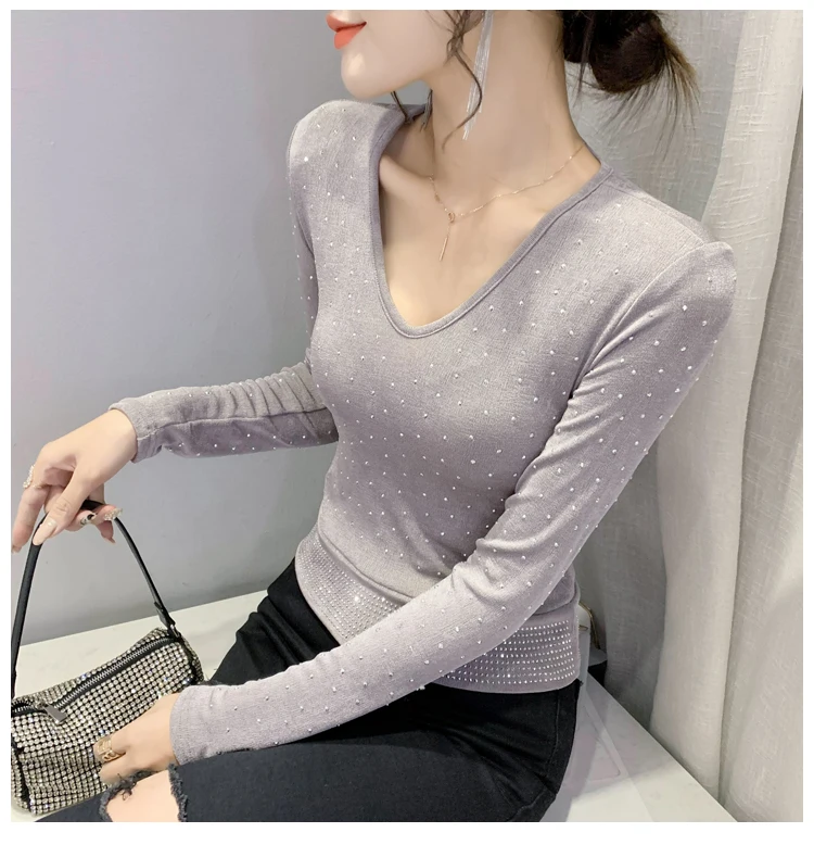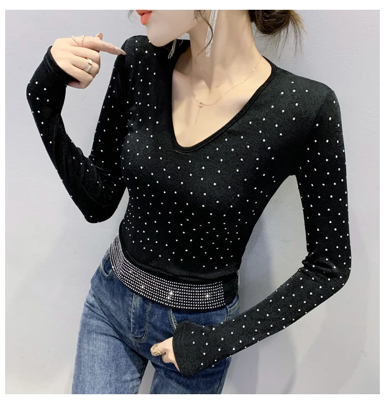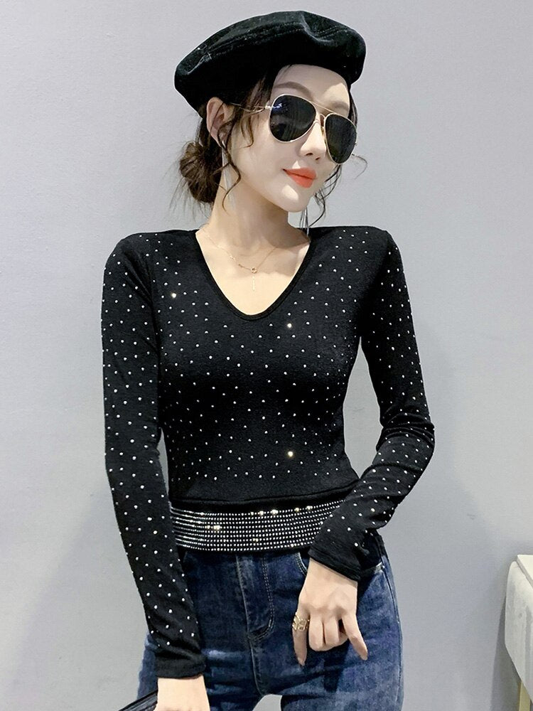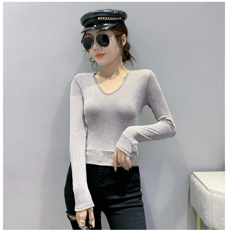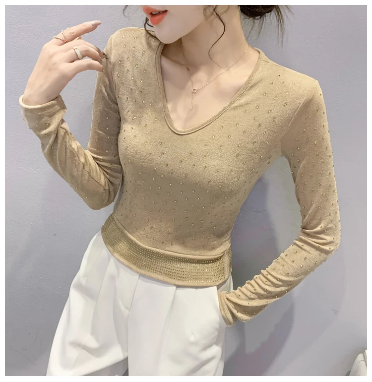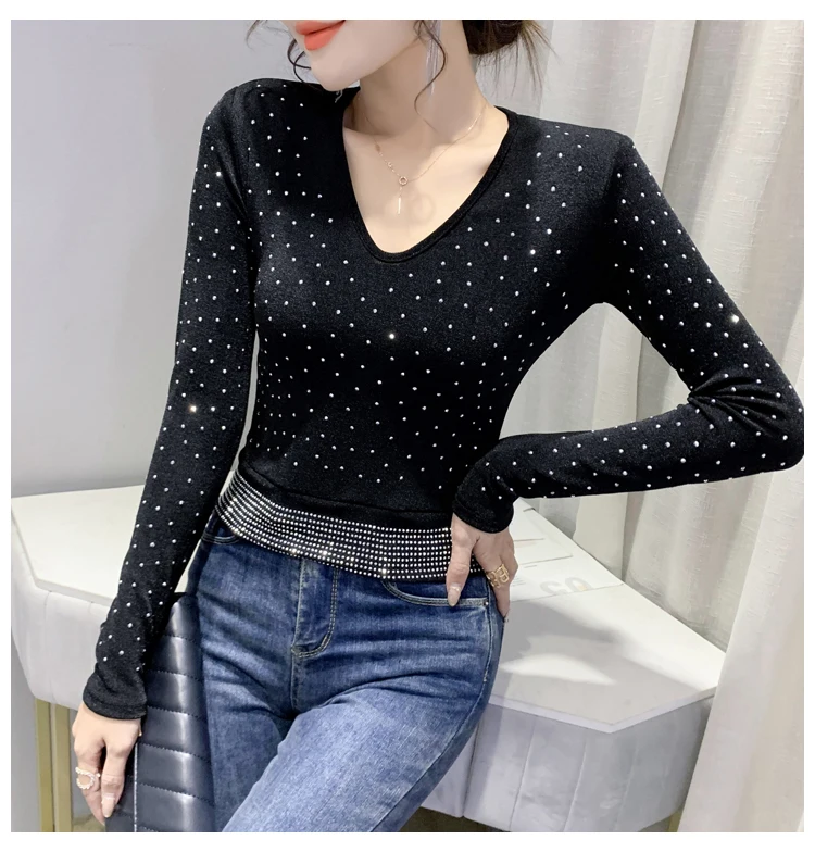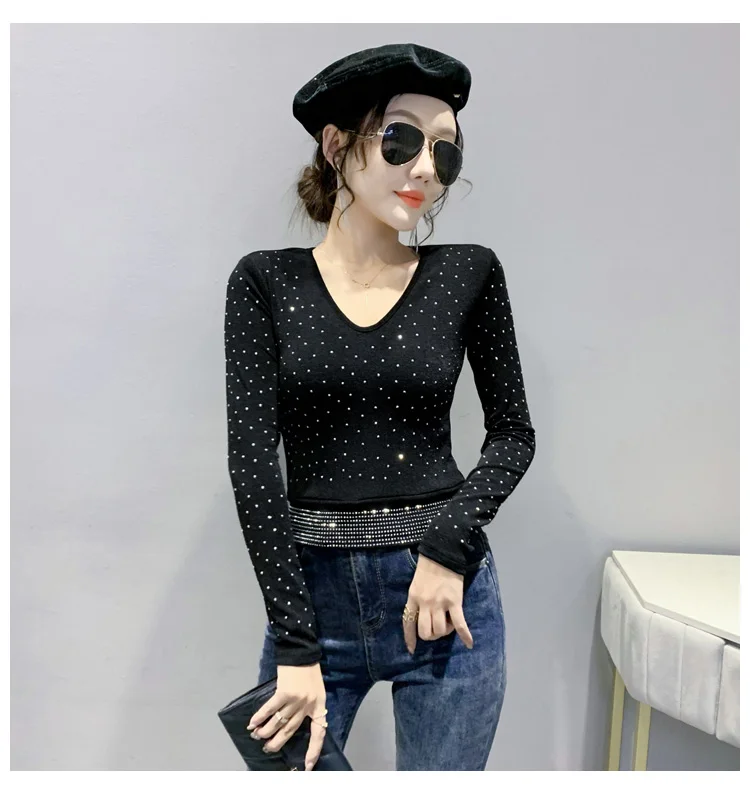 New 2022 Spring Women's T-Shirt Long Sleeved V-Neck Hot Drilling Mesh Tops Elegant Slim M-3XL Plus Size Women Clothing