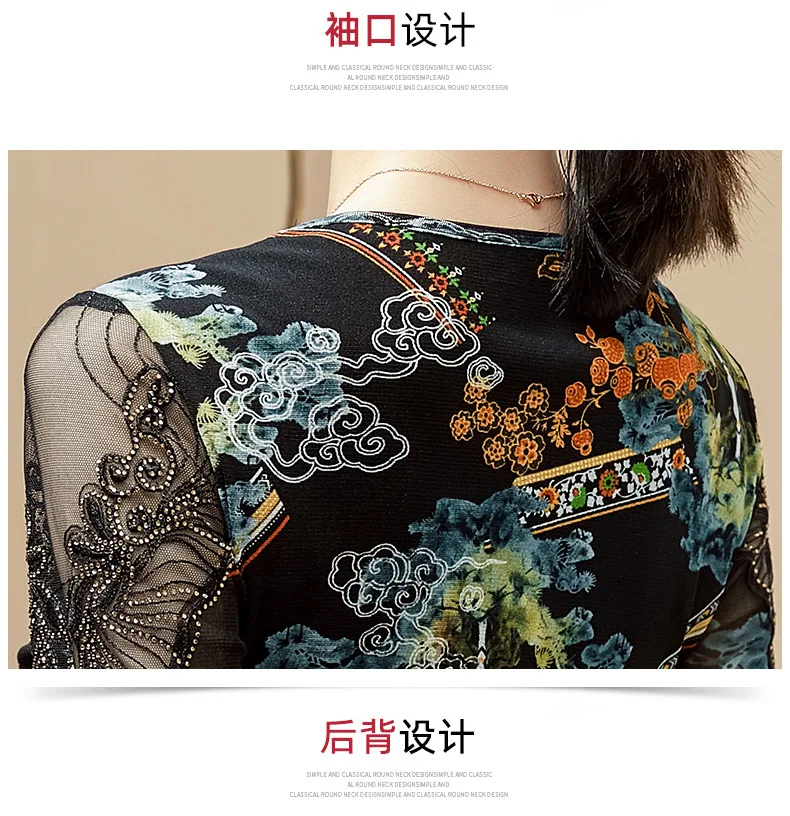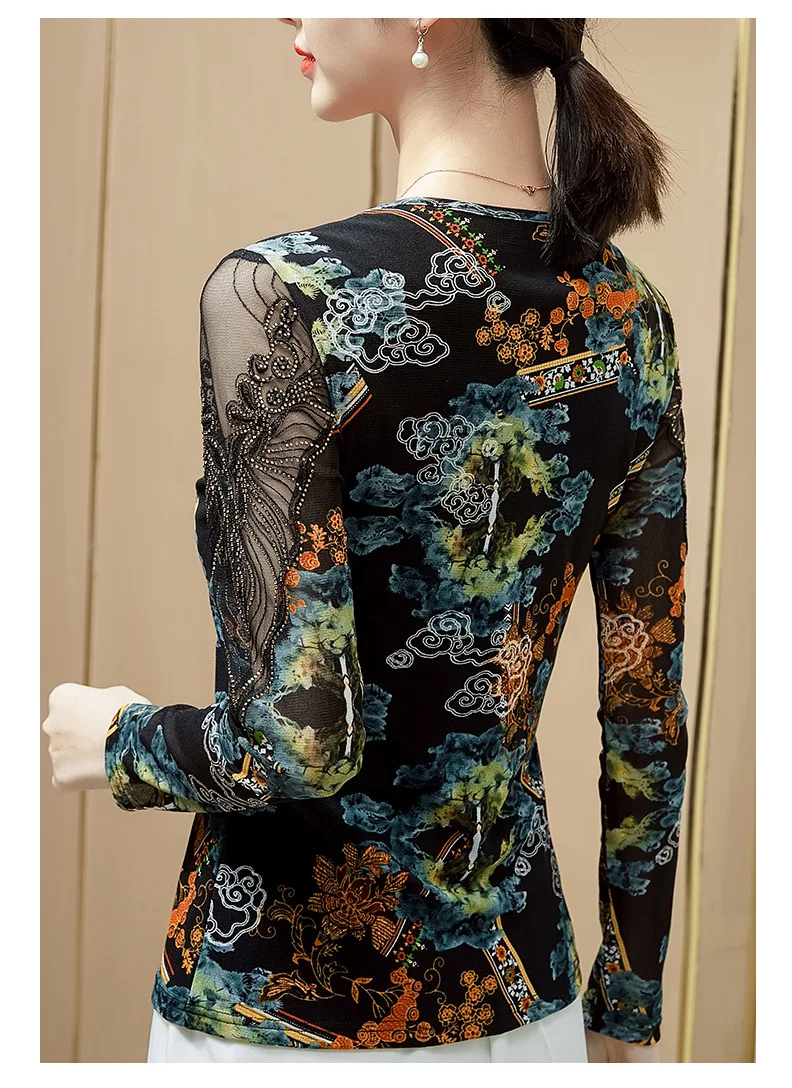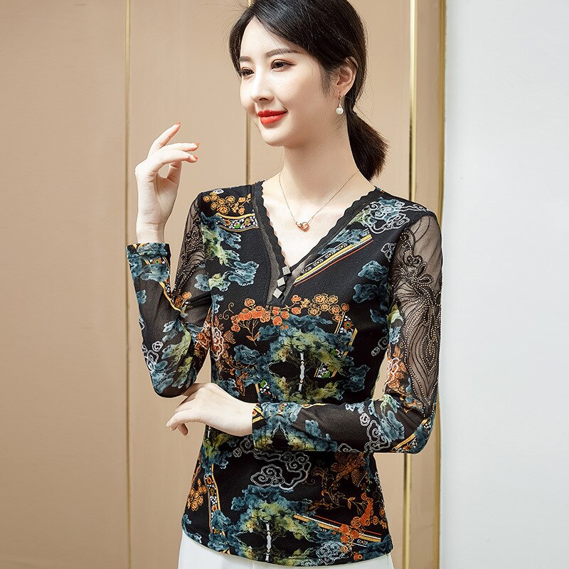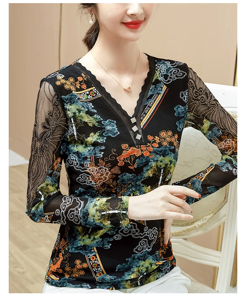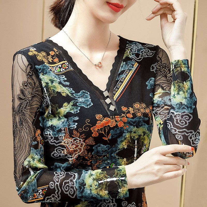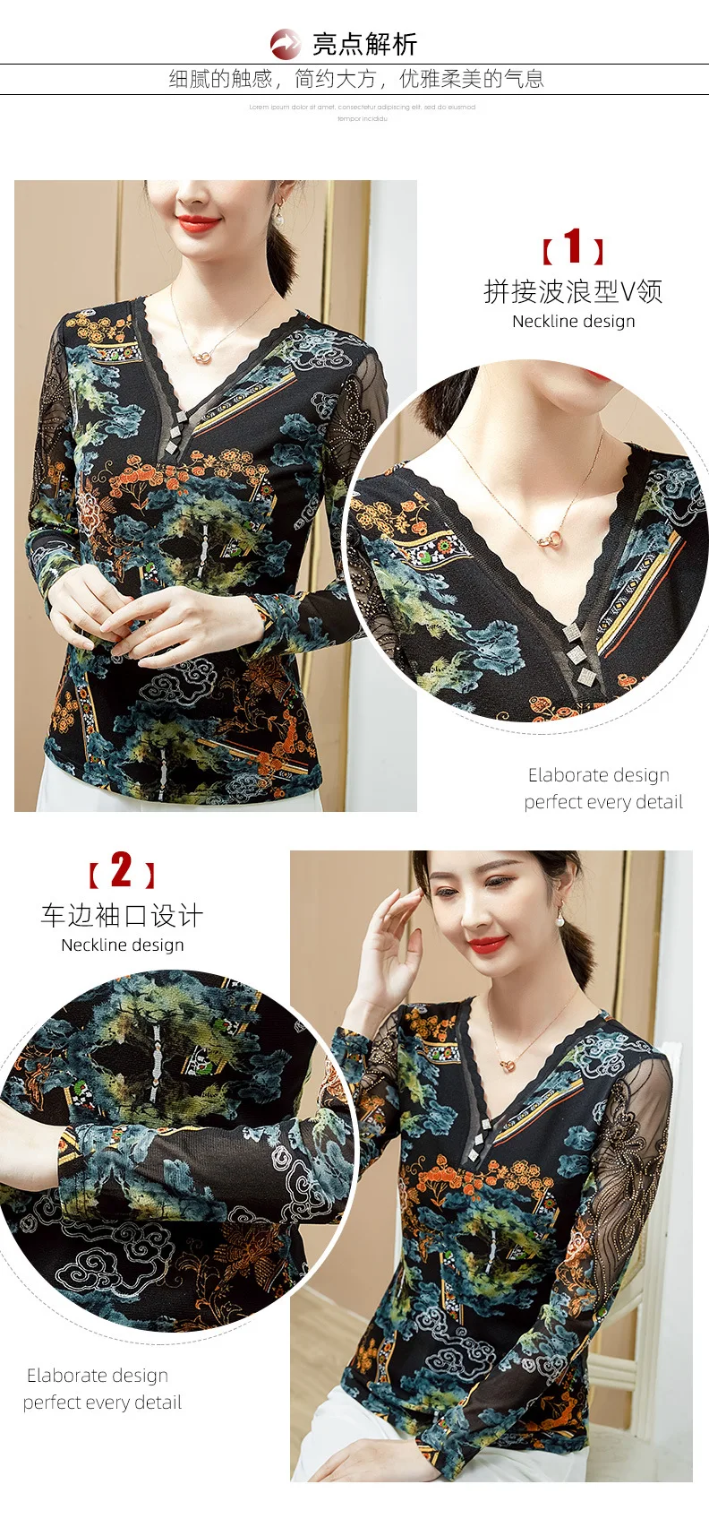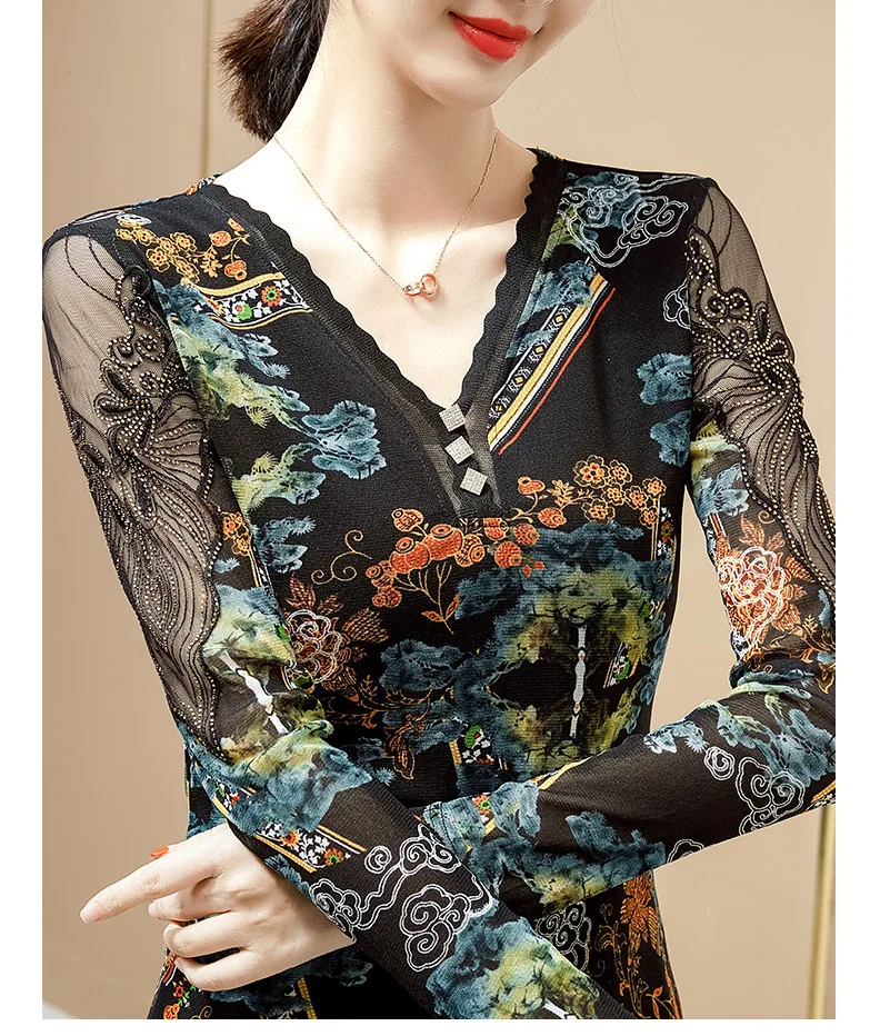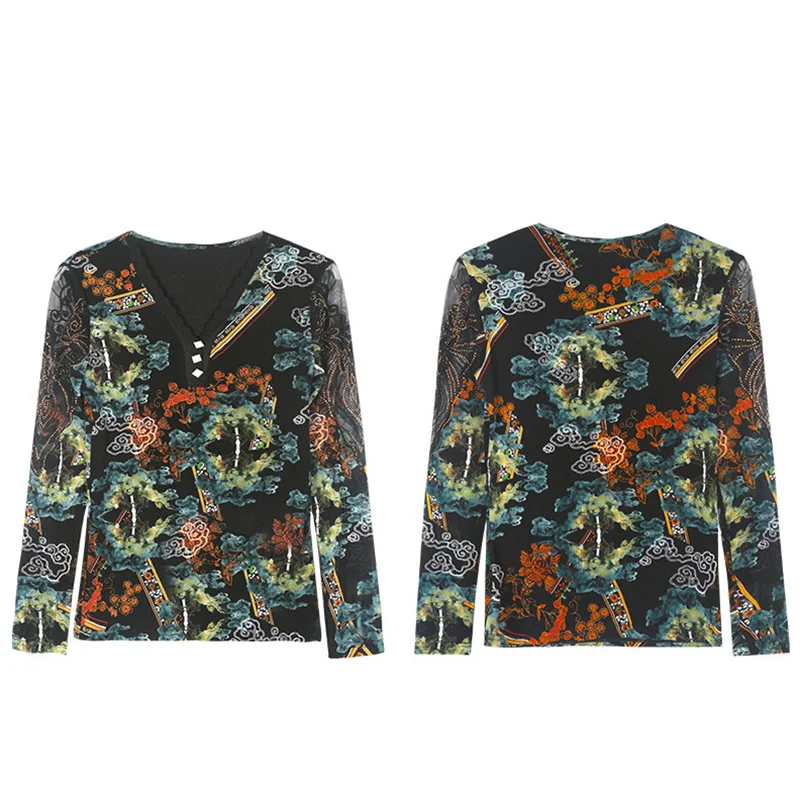 New Arrivals 2021 Autumn Long Sleeve Women's T-Shirt Fashion Sexy V-Neck Mesh Tops Plus Size M-4XL Print Women Clothing