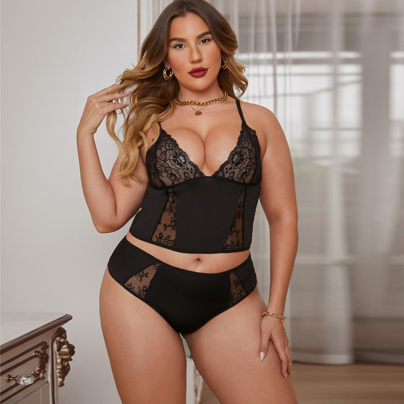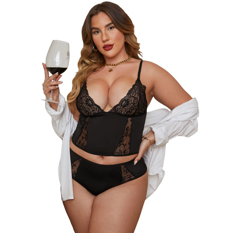 Plus Size Pajama XL-5XL Women Sexy Lingerie Sets Exotic Lace Poplin Suspenders Underwear Suit Black Sleepwear Top Briefs