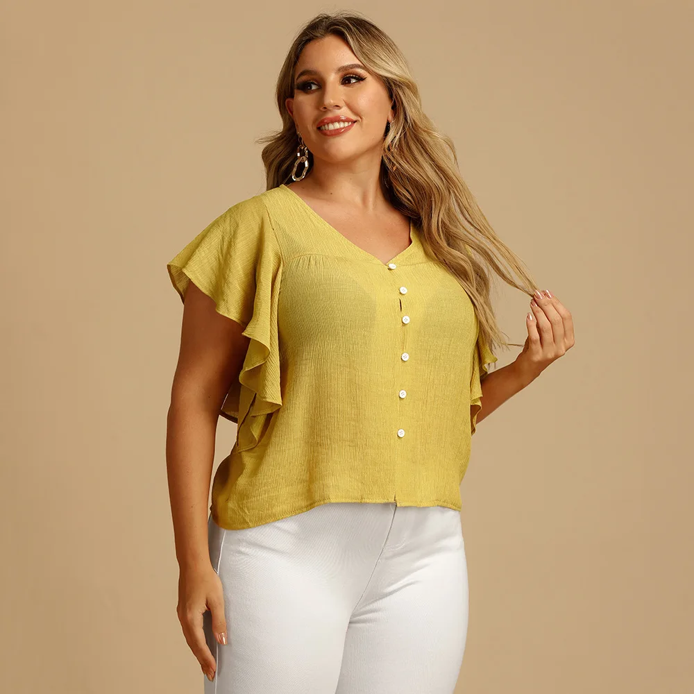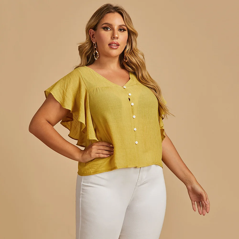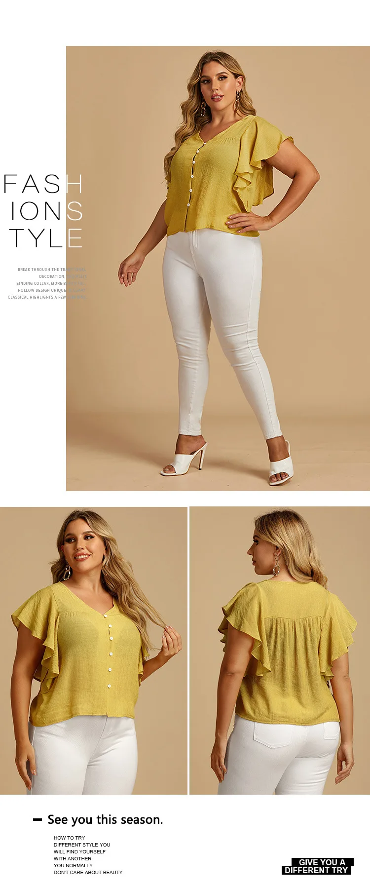 Plus Size Women Summer Fashion Top V Neck Button Up Butterfly Short Sleeve Blouses Femme Yellow XL XXL XXXL 4XL