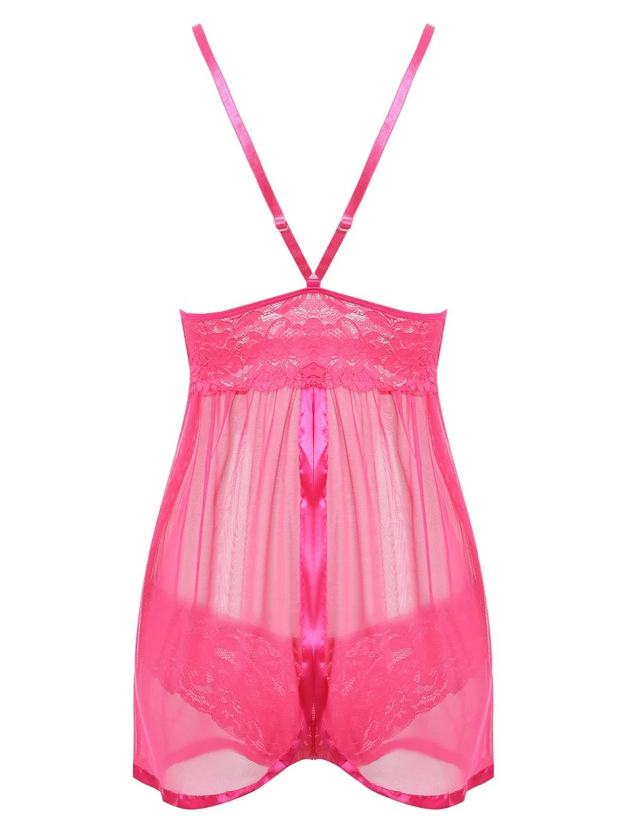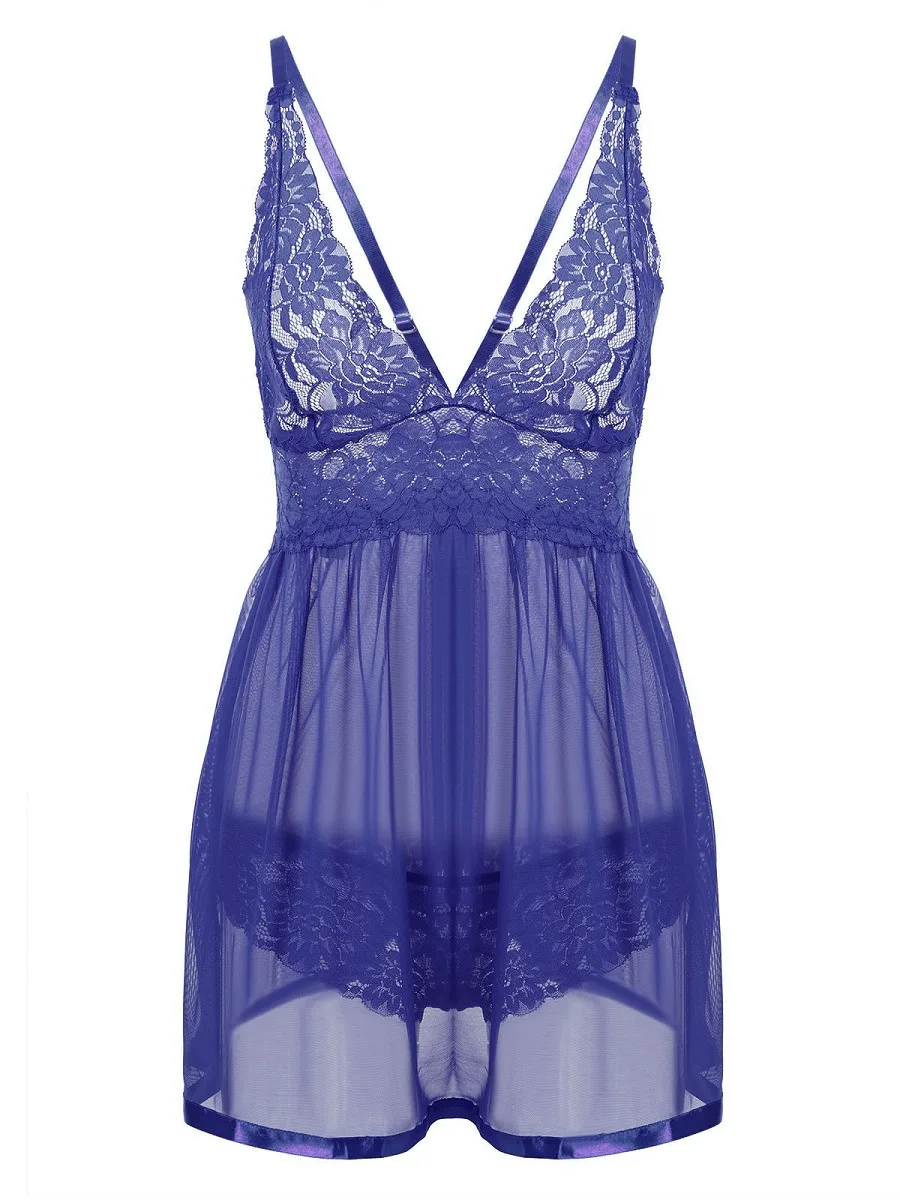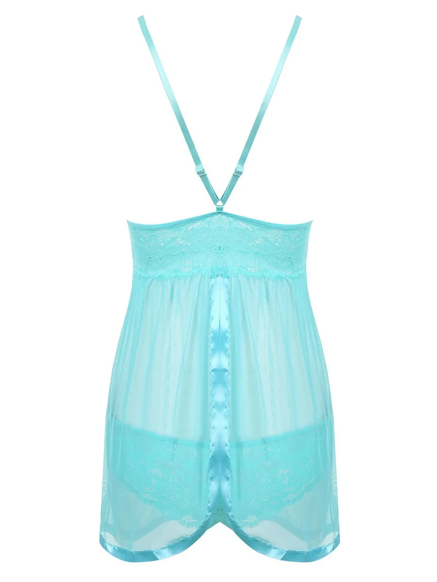 This women's lace and mesh underwear set suspender pajamas, lace cups, V-neck, adjustable thin shoulder straps, lace under the bust strap, open back and mesh skirt, satin trim.