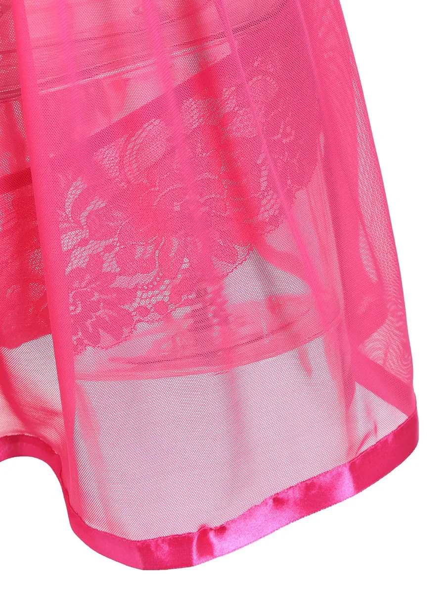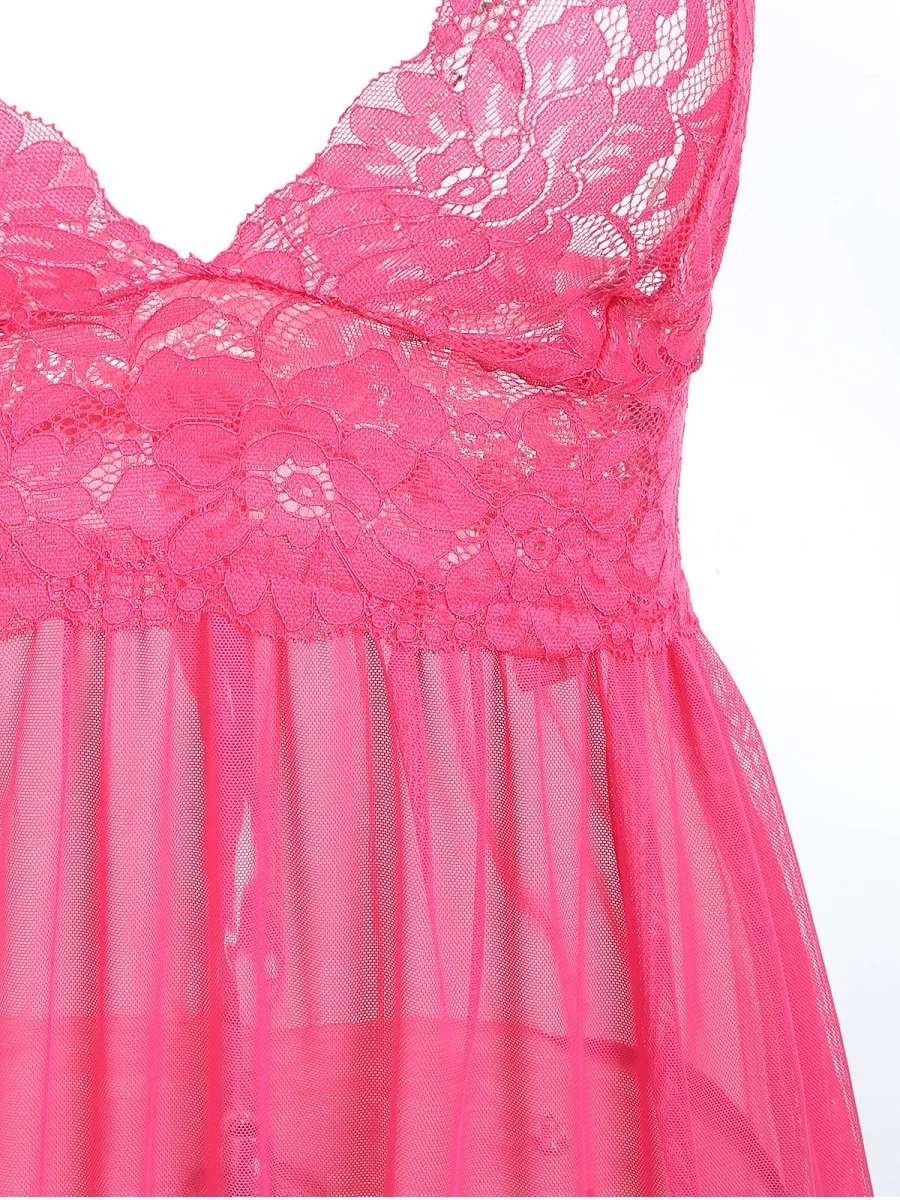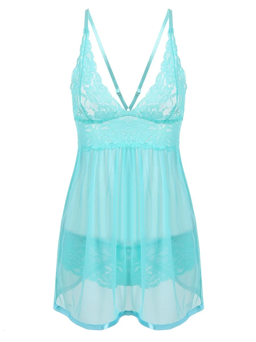 This women's lace and mesh underwear set suspender pajamas, lace cups, V-neck, adjustable thin shoulder straps, lace under the bust strap, open back and mesh skirt, satin trim.
