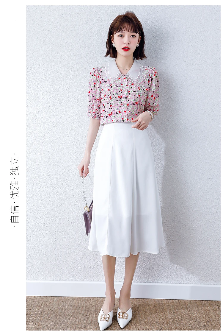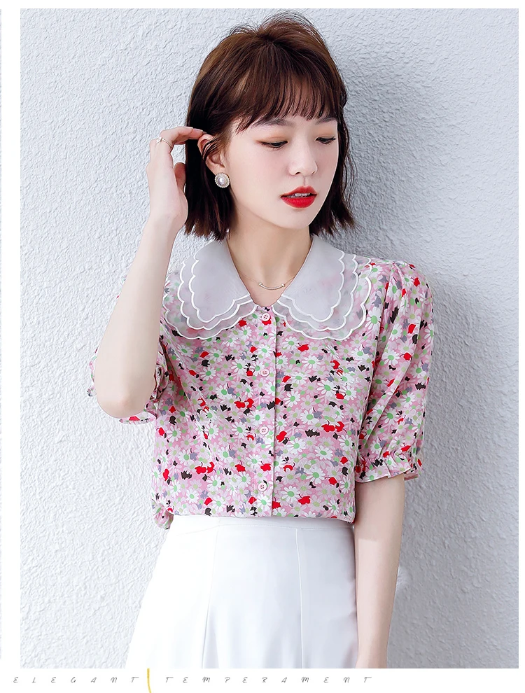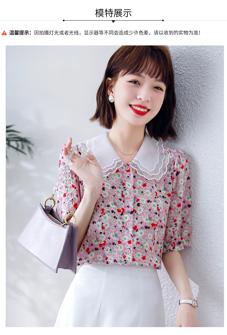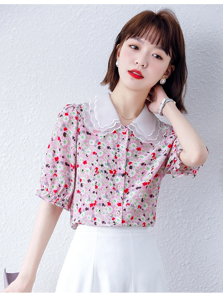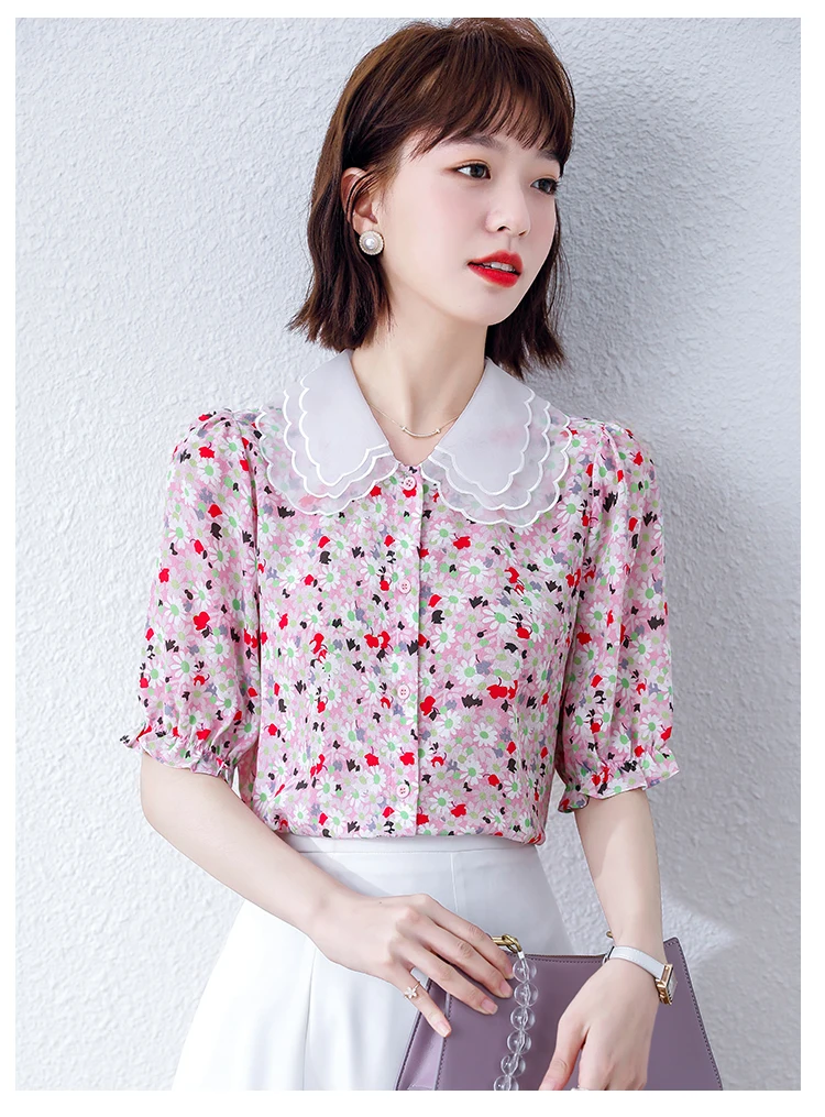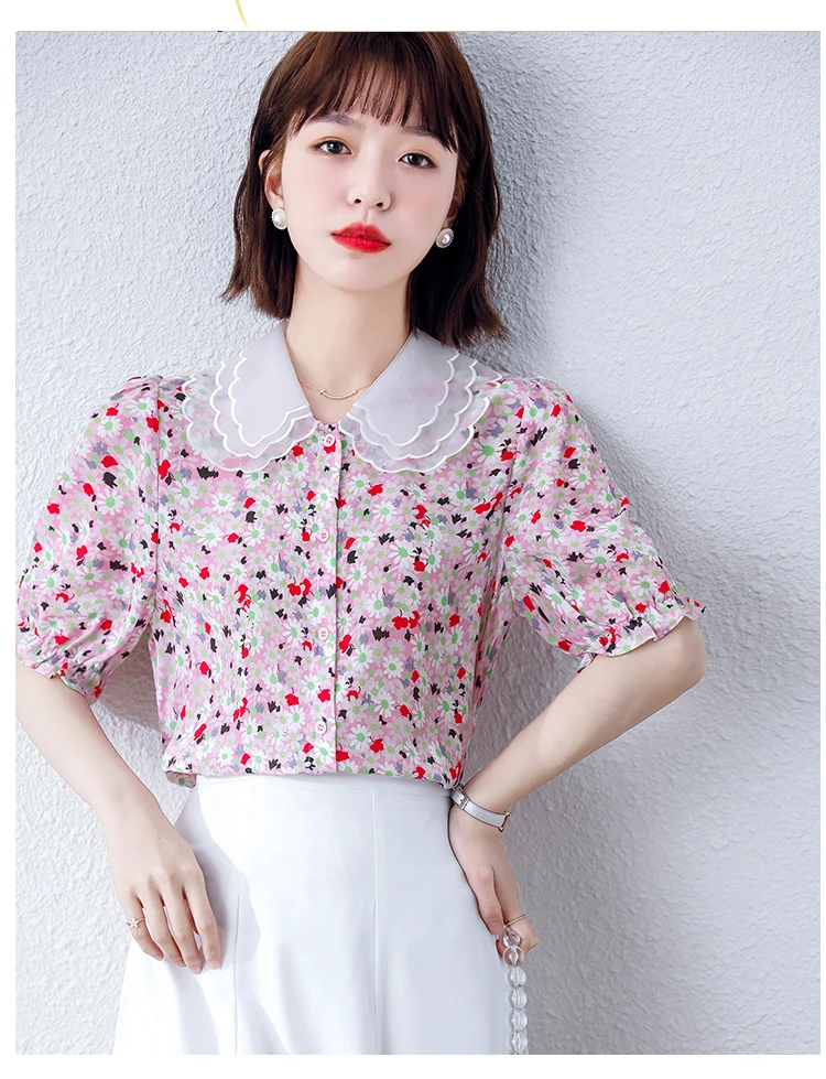 Summer Korean Fashion Silk Woman Shirts Floral Satin Office Lady Short Sleeve Buttoned Shirt Plus Size Ladies Tops Lace Blouse