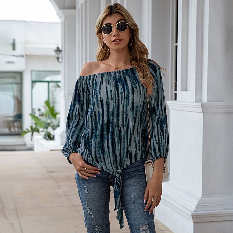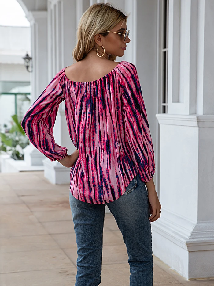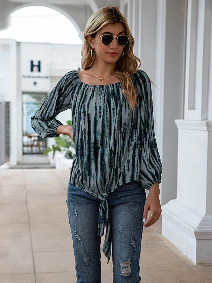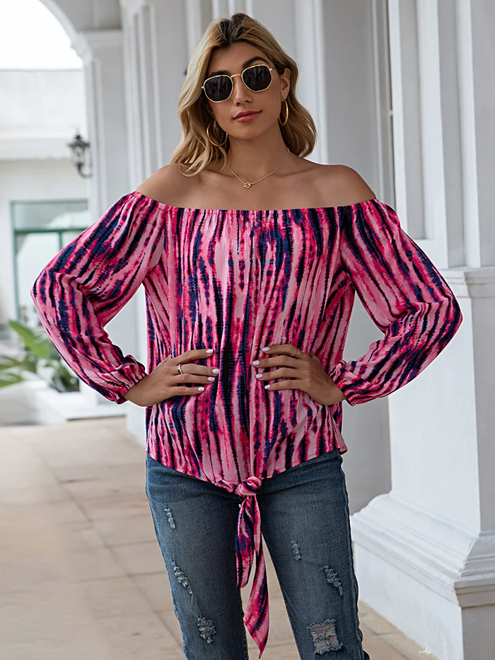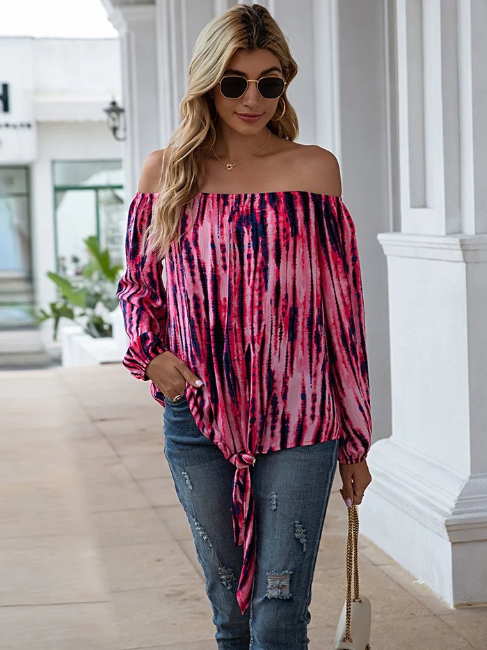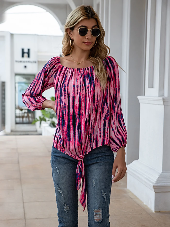 Summer Tie Dye Slash Neck Long Sleeve T Shirt Women Casual Loose Plus Size Bandage Streetwear Daily Workwear Tops