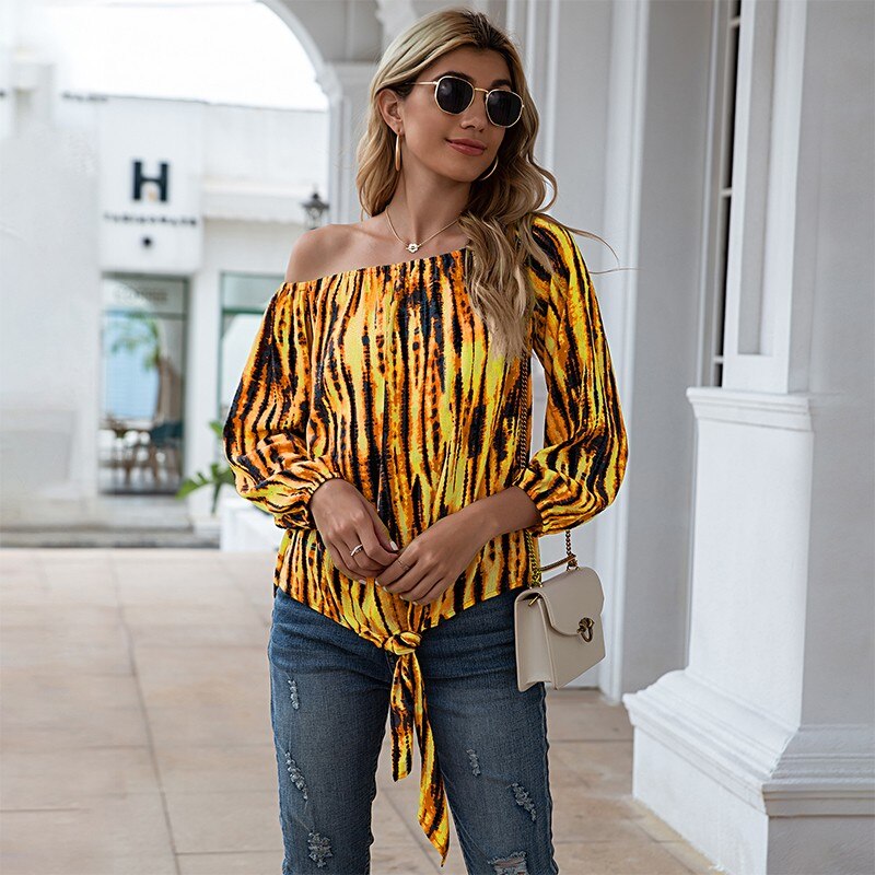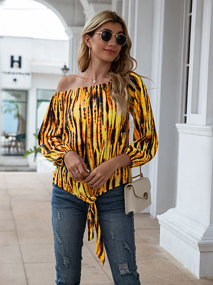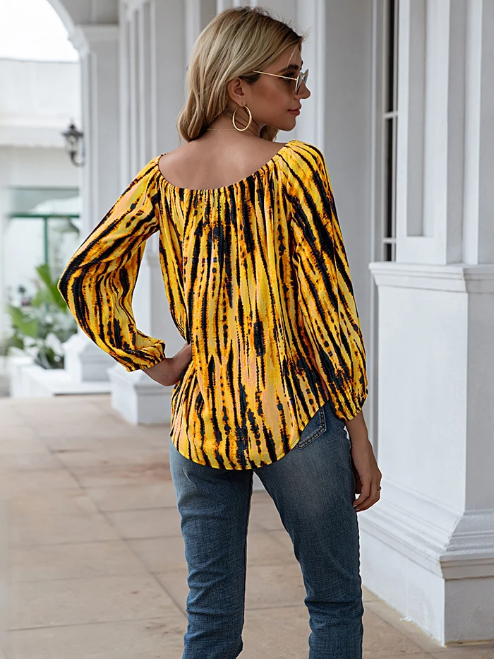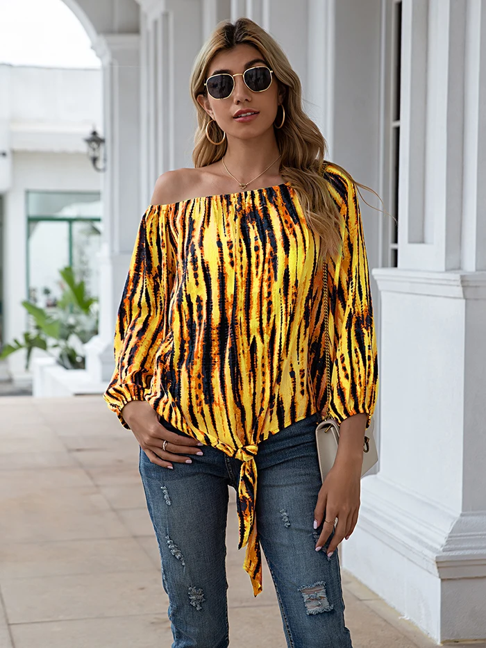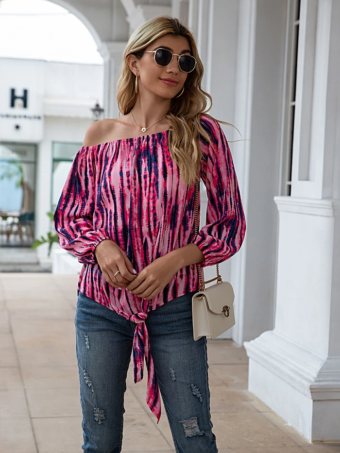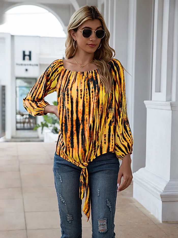 Summer Tie Dye Slash Neck Long Sleeve T Shirt Women Casual Loose Plus Size Bandage Streetwear Daily Workwear Tops