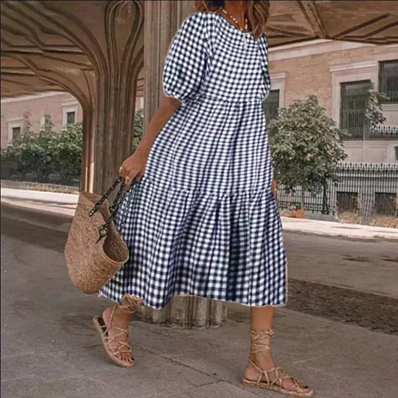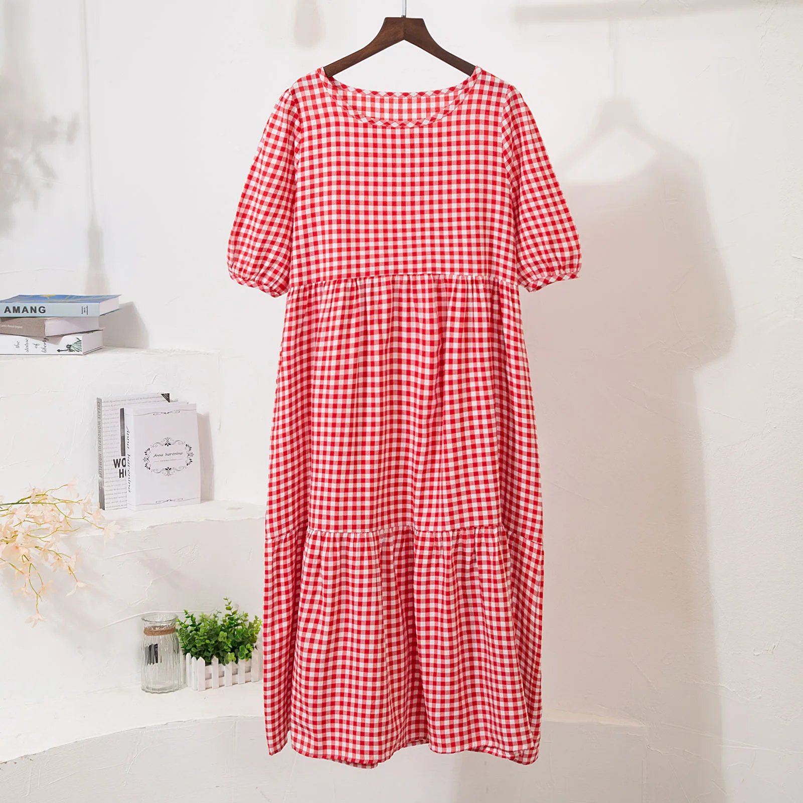 Dress with plaid print features O neck and short sleeves. Loose fit makes it quite comfortable and cool to wear. Have one for the hot summer.