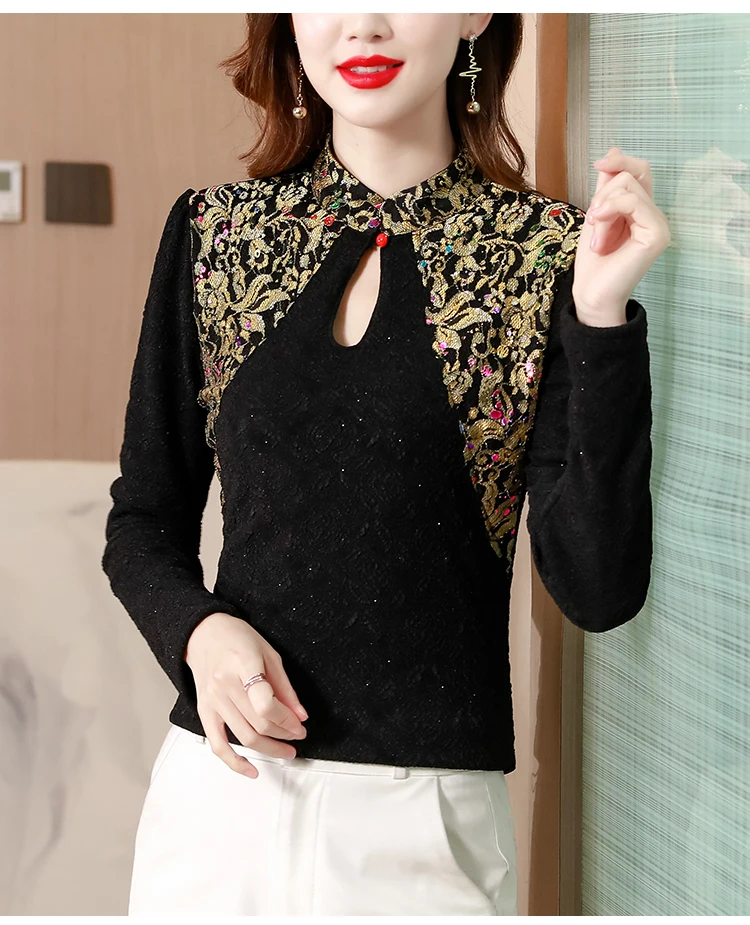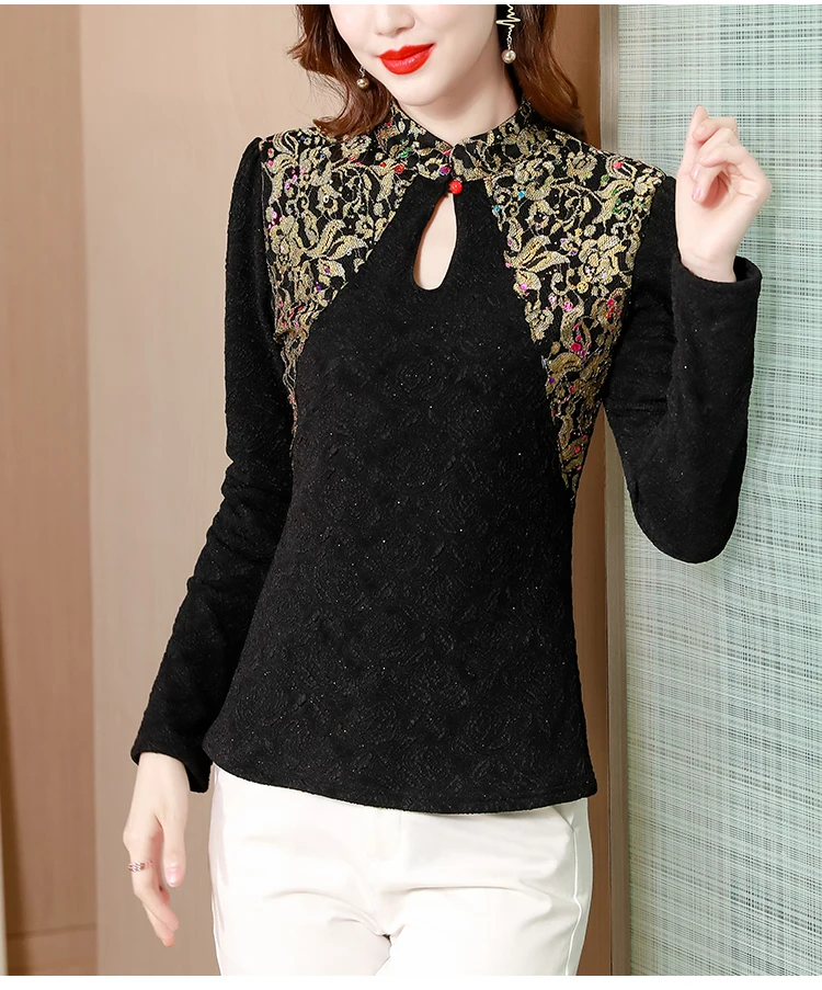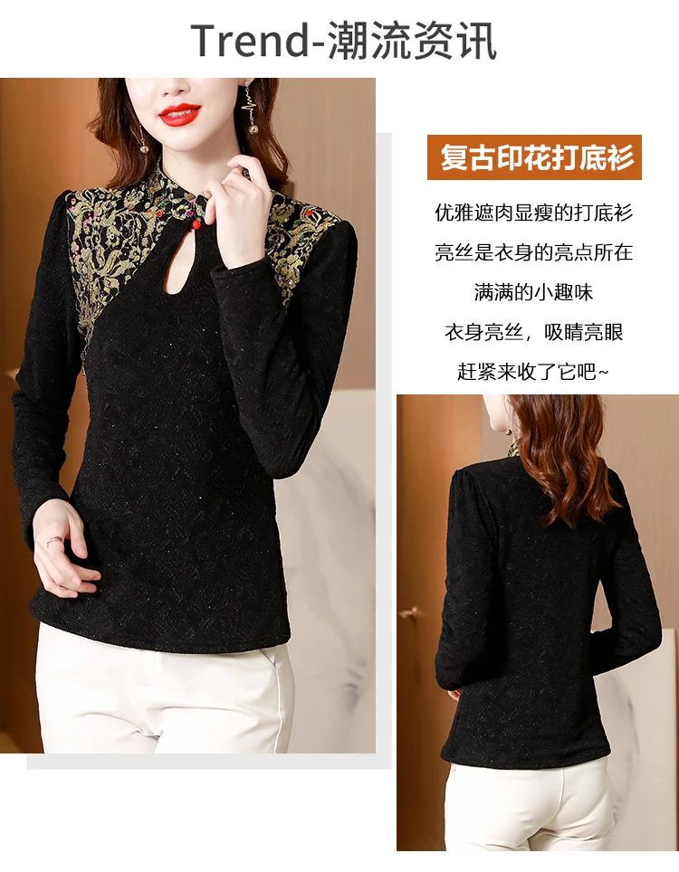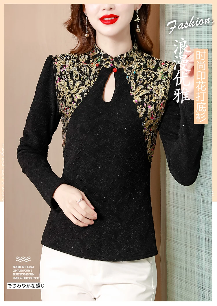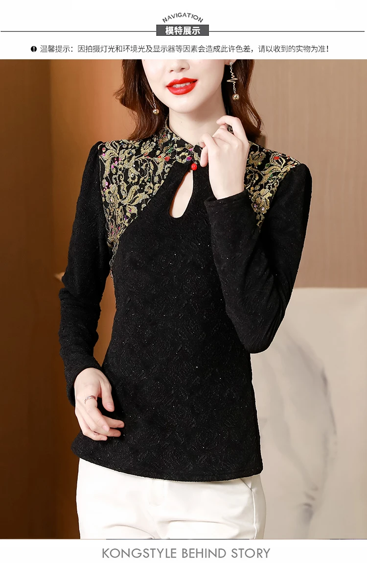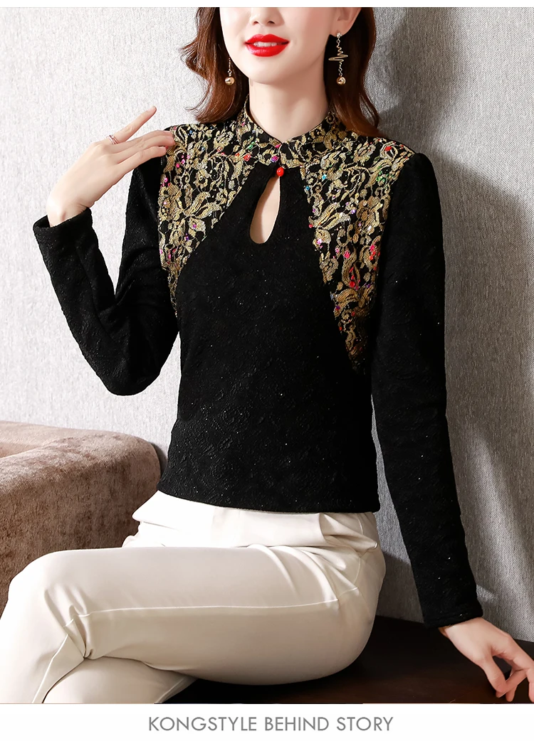 Women Blouse Shirt New 2021 Autumn Winter Long Sleeve Lace Tops Elegant Slim Embroidery Print Retro Shirt M-4XL Plus Size