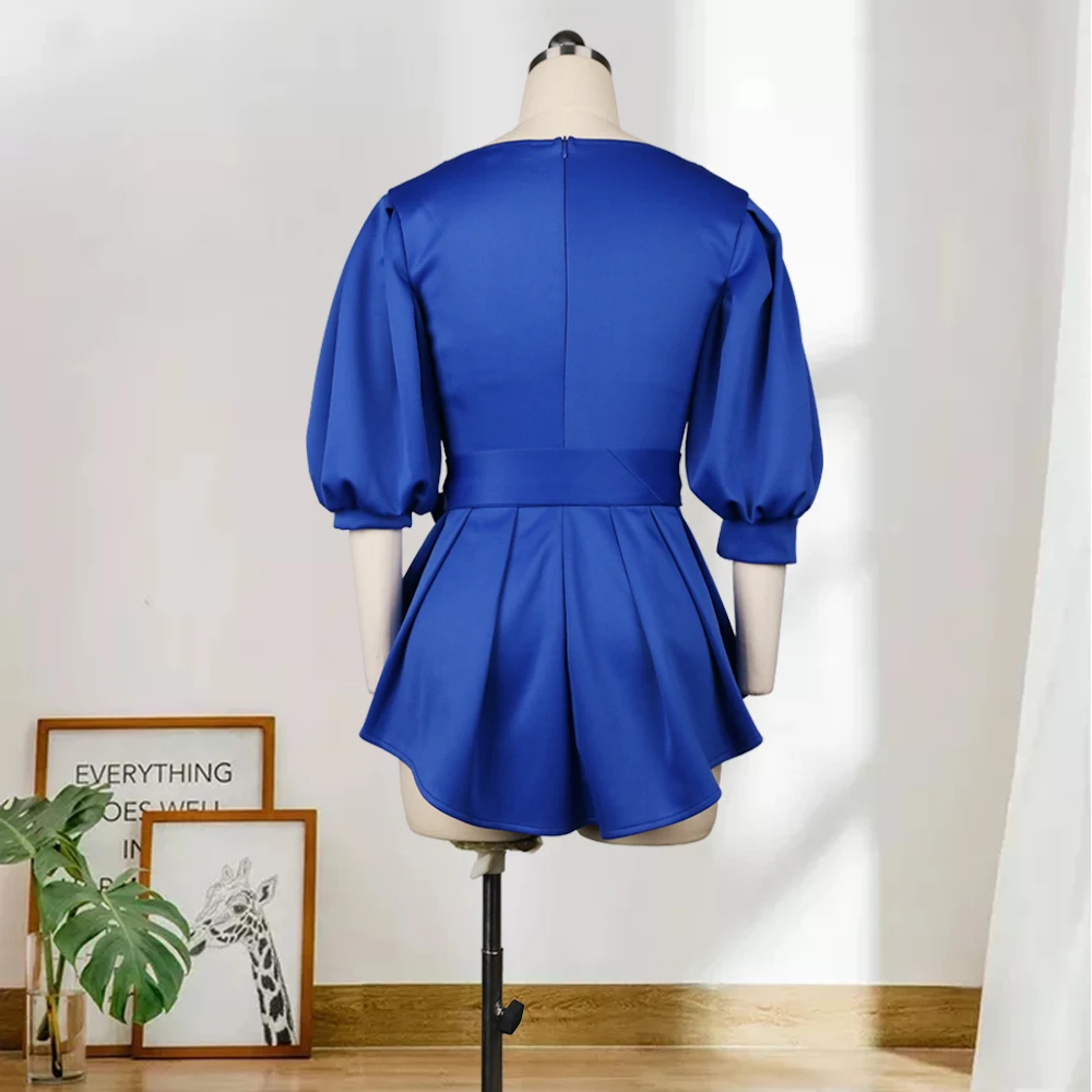 Women Blouses V Neck Short Lantern Sleeve with Sashes Peplum Ruffles Plus Size XXL Elegant Office Lady Work Shirt Female Blusas