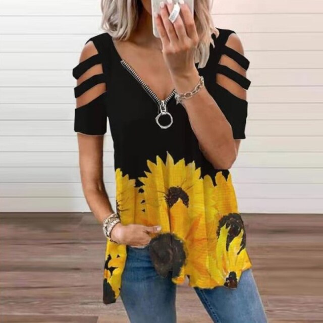 Women Strapless V Neck Print Sexy Deep Low Cut Tops Blouse Shirt Out Zipper Short Sleeve Casual Pullover Summer Plus Size Blusa