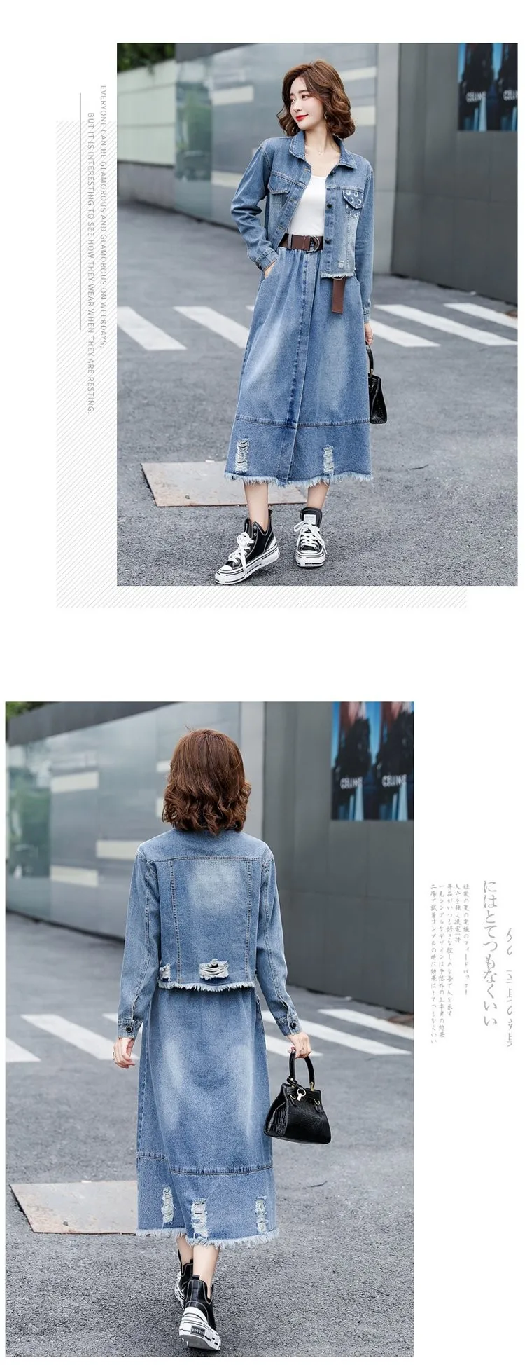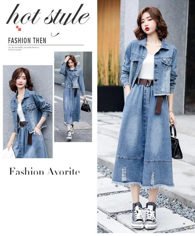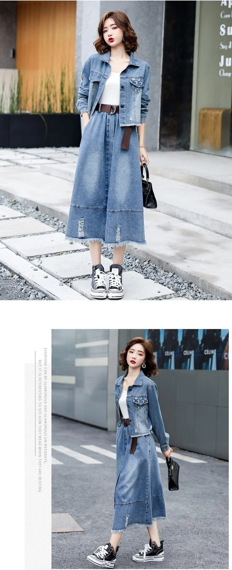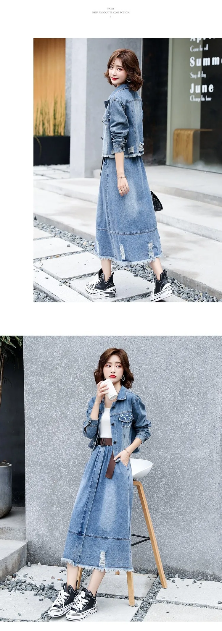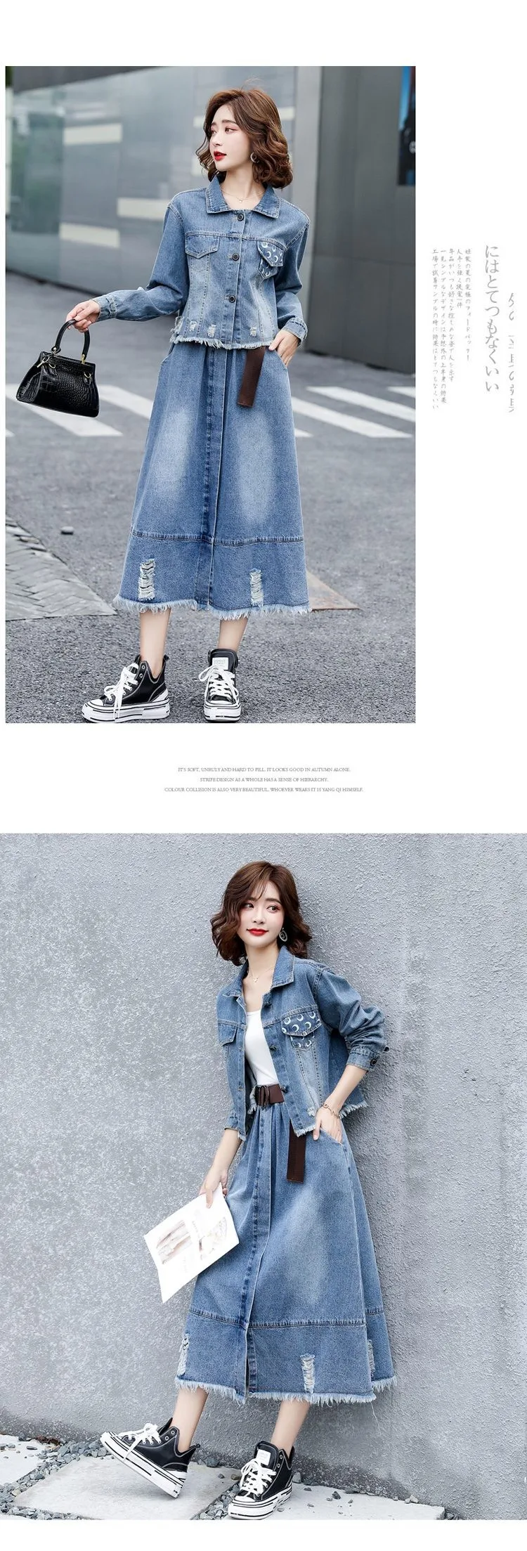 Women's Autumn Suits New Loose Casual Denim Short Jacket + High Waist Skirt 2-Piece Sets Female Plus Size S-2XL
