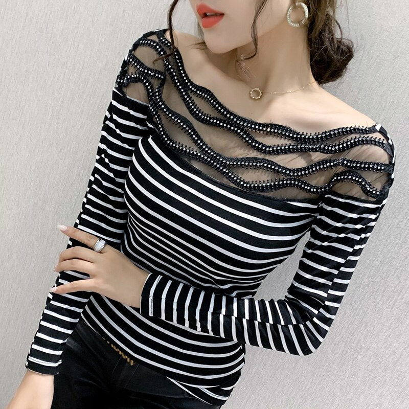 Women's T-shirts New 2021 Autumn long sleeve woman tshirts Sexy Beaded Perspective Plus size tops and shirt blusas