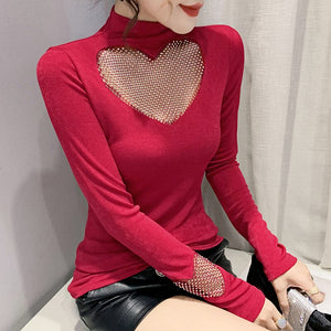 Autumn Long Sleeve Women T-Shirt Fashion Casual Sexy Hollow Out Diamonds Mesh Tops M-3XL Plus Size Female Blusas  - Regular price